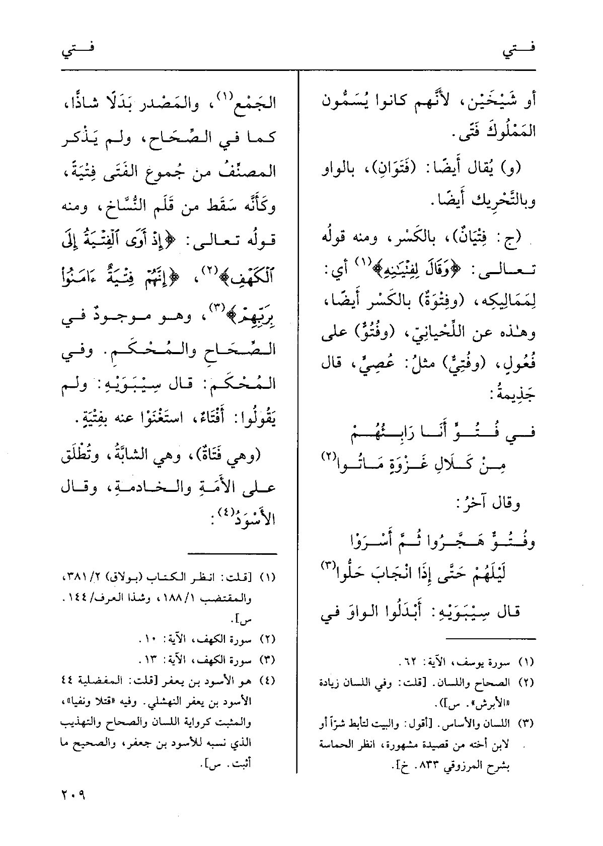 وَلم يَذْكرِ المصنِّفُ مِن جُموعِ الفَتَى فِتْيَة، وكأَنَّه سَقْطٌ من قَلَمِ النسَّاخِ؛ وَمِنْه قولُه تَعَالَى: {إِذا أَوَى {الفِتْيَةُ إِلَى الكَهْفِ} ، {إنَّهم} فِتْيةٌ آمَنُوا بربّهم} ؛ وَهُوَ مَوْجودٌ فِي الصِّحاح والمُحْكم.