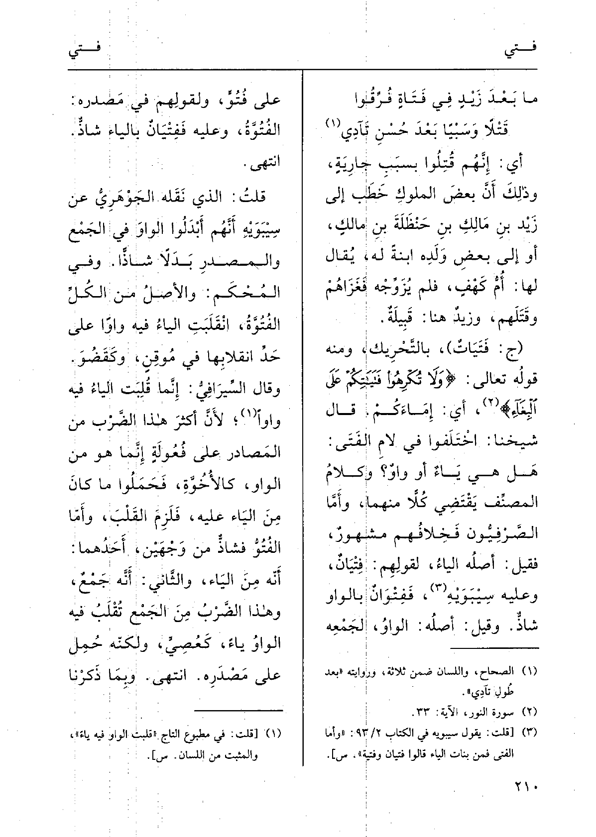 قُلْت: الَّذِي نقلَهُ الجَوْهرِي عَن سِيْبَوَيْه أنَّهم أَبْدَلُوا الواوَ فِي الجَمْعِ والمَصْدرِ بَدَلاً شاذًّا، وَفِي المُحْكم: والأصْلُ مِن الكُلِّ الفُتُوَّةَ انْقَلَبتِ الياءُ فِيهِ واواً على حَدِّ انْقِلابِها فِي مُوقِنٍ وكفَضُوَ. وقالَ السِّيرافي: إنَّما قُلِبَتِ الواوُ فِيهِ يَاء لأنَّ أَكْثَر هَذَا الضَّرْب مِن المصادِرِ على فُعولَةٍ إنَّما هُوَ من الواوِ كالأُخُوَةِ، فحَمَلُوا مَا كانَ من الياءِ عَلَيْهِ فلَزِمَ القَلْب، وأَمَّا الفُتُوُّ، فشاذٌّ من وَجْهَيْن: أَحَدُهما: أَنَّه من الياءِ، وَالثَّانِي: أنَّه جَمْعٌ، وَهَذَا الضَّرْبُ مِن الجَمْع تُقْلَبُ فِيهِ الواوُ يَاء كعِصِيَ، ولكنَّه حملَ على مَصْدرِهِ، انتَهَى. وَبِمَا ذَكَرْنا
