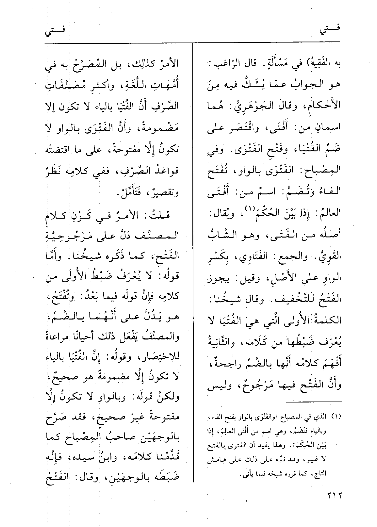وَقَالَ شيْخُنا: الكَلمةُ الأُوْلى الَّتِي هِيَ الفُتْيَا لَا يُعْرَفُ ضَبْطها من كَلامِه، والثانِيَة أَفْهم كَلامه أَنَّها بالضمِّ راجِحَة، وأنَّ الفَتْح فِيهَا مَرْجوحٌ، وليسَ الأمْرُ كذلكَ، بل المُصَرَّحُ بِهِ فِي أُمَّهاتِ اللُّغَةِ وأَكْثَر مُصنَّفاتِ الصَّرْف أَنَّ الفُتْيا بالياءِ لَا تكونُ إلاَّ مَضْمومةً، وأَنَّ الفَتْوَى بالواوِ لَا تكونُ إلاَّ مَفْتوحةً على مَا اقْتَضَتْه قَواعِدُ الصَّرْفِ. فَفِي كَلامِه نَظَرٌ وتقصيرٌ فتأَمَّل.