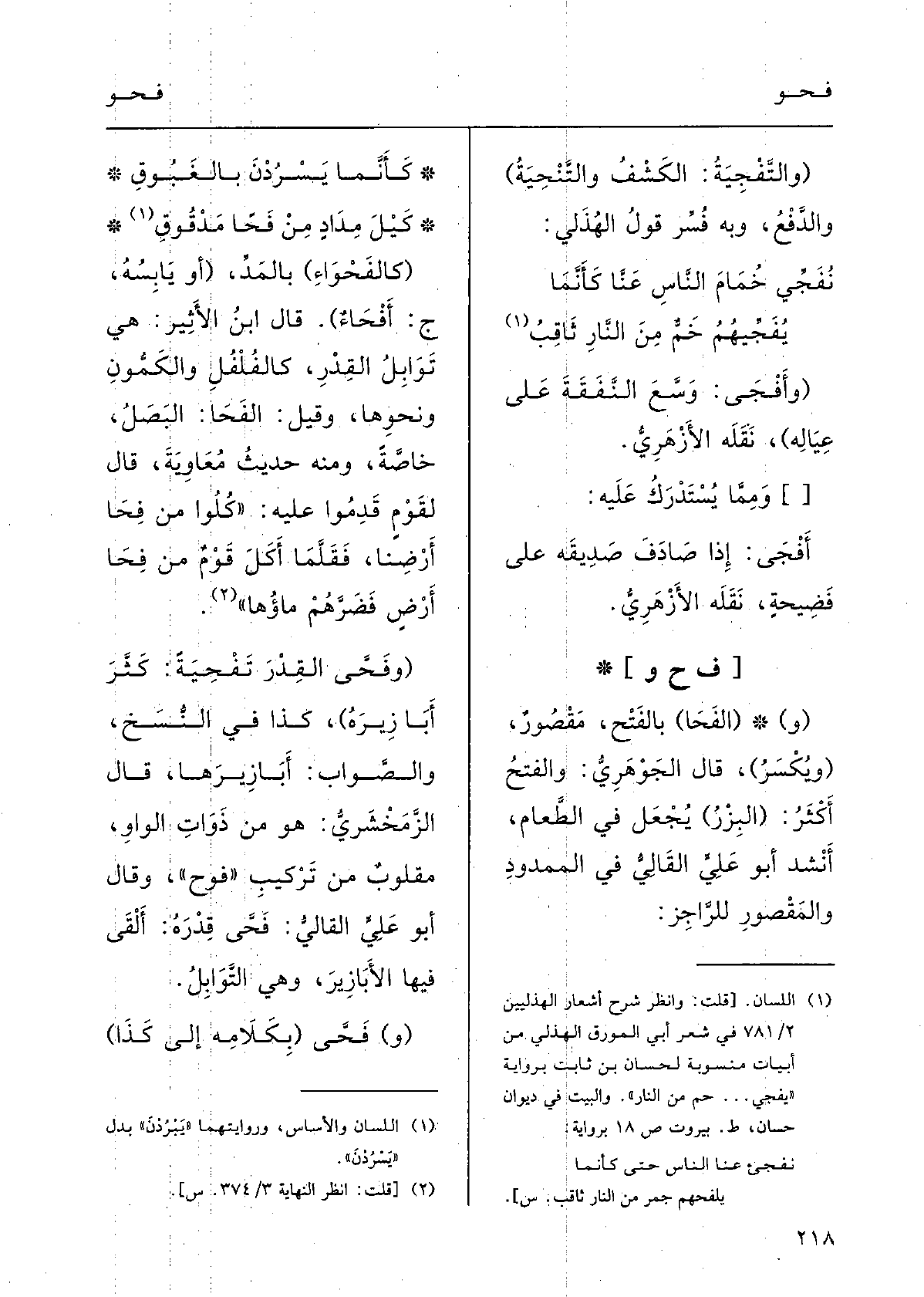 (قالَ ابنُ الأَثِيرِ: هِيَ تَوابِلُ القدْرِ كالفُلْفُلِ والكمُّون ونَحْوِها؛ وقيلَ: الفَحَا: البَصَلُ خاصَّة؛ وَمِنْه حديثُ مُعاوِيَةَ: قالَ لقَوْمٍ قَدِموا عَلَيْهِ: (كلُوا مِن} فِحا أَرْضِنا فقَلَّما أَكَلَ قوْمٌ مِن فِحَا أَرْضٍ فضَرَّهم ماؤُها) .