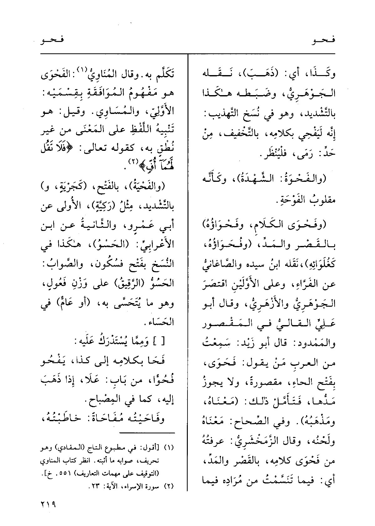 وَقَالَ الْمَنَاوِيّ:} الفَحْوَى هُوَ مَفْهومُ المُوافَقَة بقسْمَيْه الأولى والمساوي، وقيلَ: هُوَ تَنْبِيهُ اللّفْظِ على المَعْنى من غيرِ نُطْقٍ بِهِ كقوْلِه تَعَالَى: {فَلَا تَقُلْ لَهُما أُفَ} .