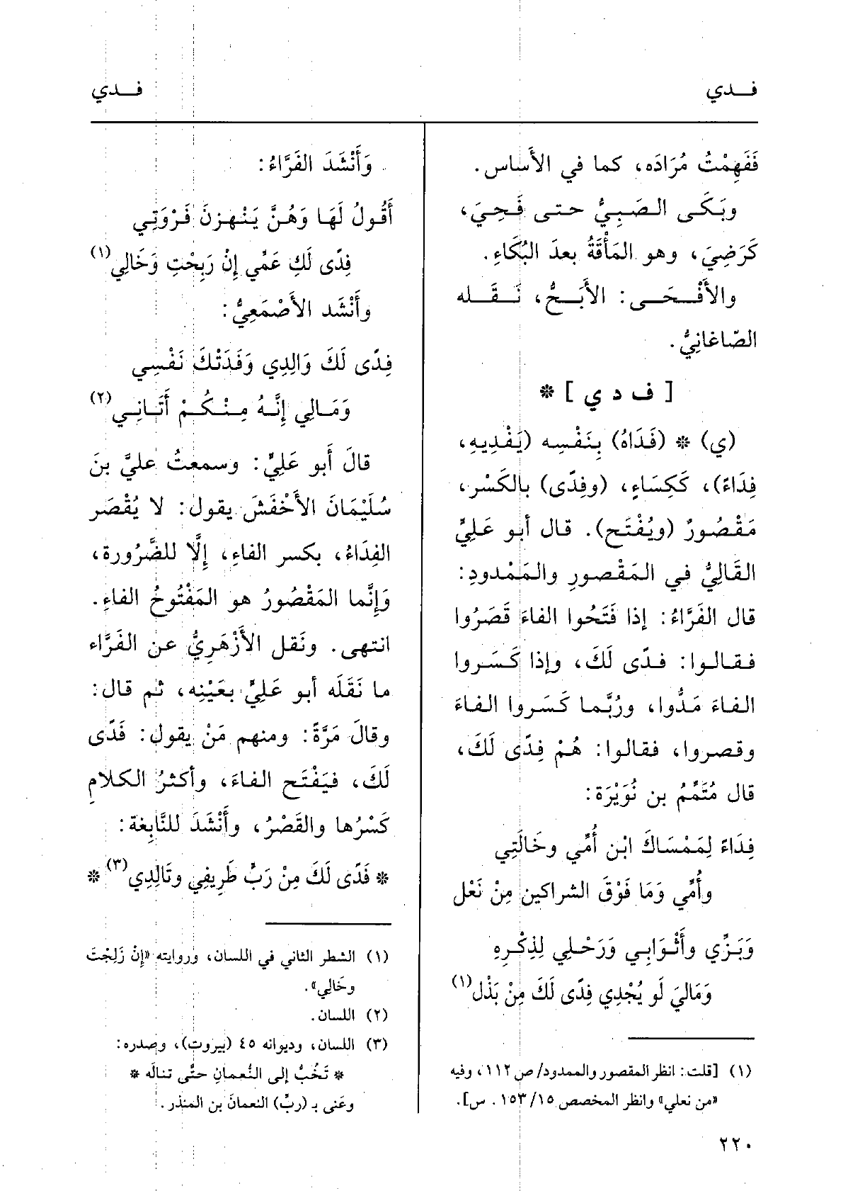 فِدًى لَكَ والِدِي وفَدَتْكَ نَفْسِي وَمَالِي إنَّه مِنْكُم أَتانِيقالَ أَبو عليَ: وسَمِعْتُ عليَّ بنَ سُلَيْمان الأخْفَش يقولُ: لَا يُقْصَرُ} الفِدَاء، بكَسْرِ الفاءِ، إلاّ للضَّرُورَةِ، وإنَّما المَقْصورُ هُوَ المَفْتوحُ الْفَاء، انتَهَى.