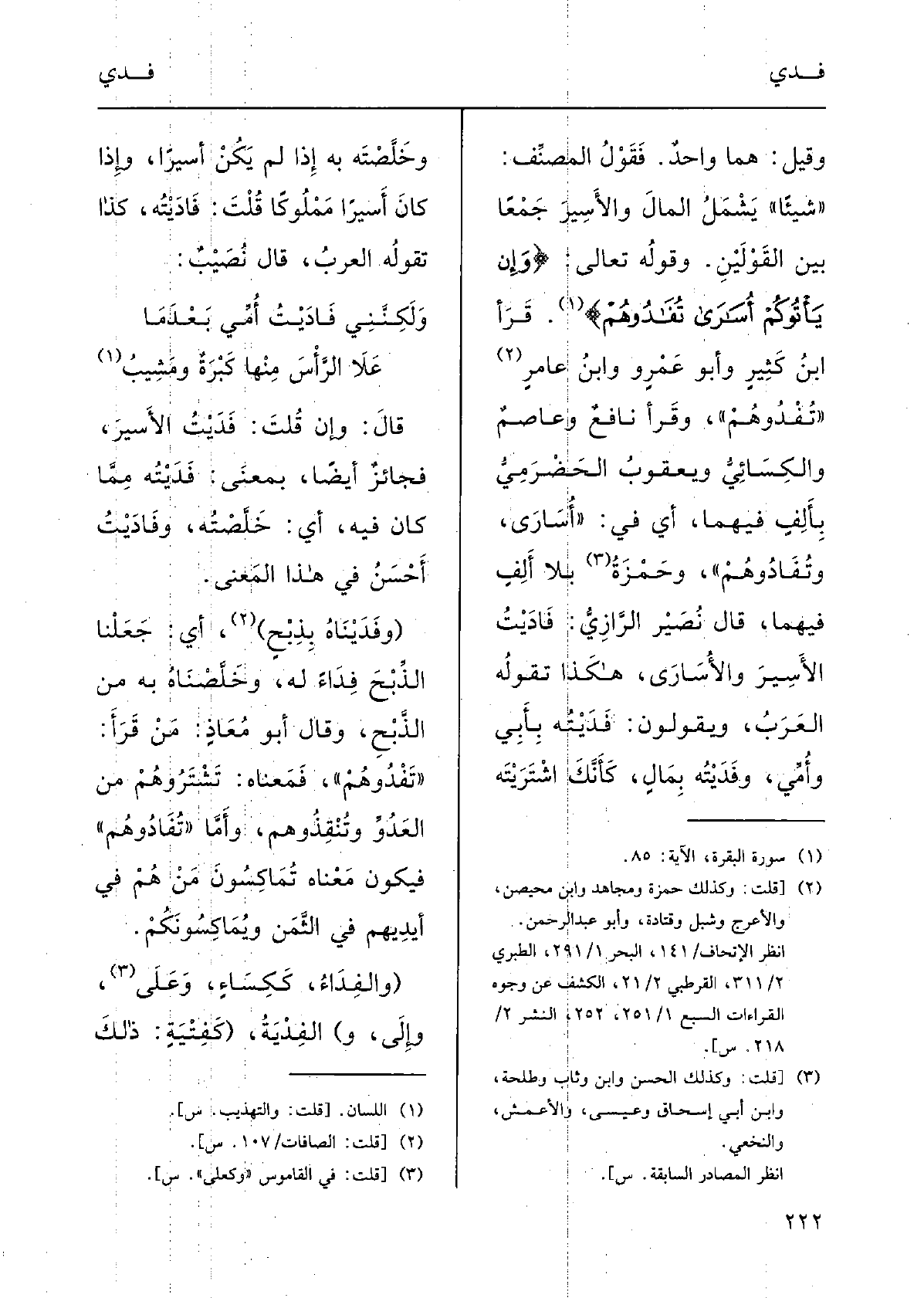 وقوْلُه تَعَالَى: {وإنْ يَأْتُوكُم أُسارَى {تُفادُوهم} ؛ قَرَأَ ابنُ كَثيرٍ وأَبو عَمْرٍ ووابنُ عامِرٍ:} تَفْدُوهُم؛ وقَرَأَ نافِعٌ وعاصِمٌ والكِسائي ويَعْقوبُ الحَضْرمي بألِفٍ فيهِما، أَي فِي أُسارَى، {وتُفادُوهُم؛ وحَمْزةُ بِلا أَلِفٍ فيهمَا.