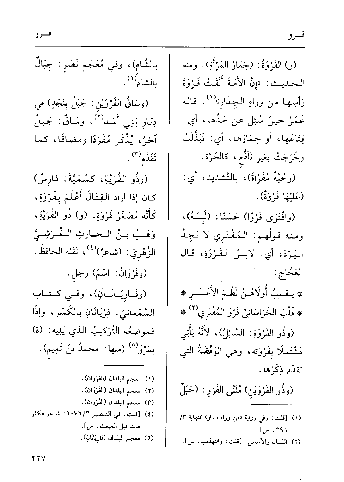 (وذُو {الفَرْوَيْنِ) ، مُثَنَّى} الفَرْو: (جَبَلٌ بالشَّامِ) .) وَفِي مُعْجم نَصْر: جِبالٌ بالشامِ.