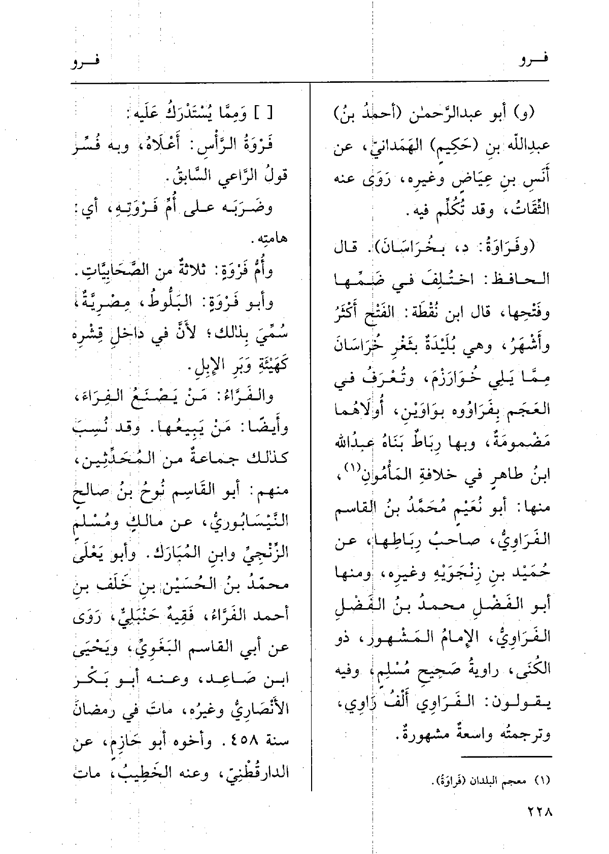 ( {وفَرَاوَةُ: د بخُرَاسانَ) ؛) قالَ الحافِظُ: اخْتُلِفَ فِي ضمِّها وفَتْحِها؛ قالَ ابنُ نُقْطَة: الفَتْحُ أَكْثَر وأَشْهَرُ، وَهِي بُلَيْدَةٌ بثَغْرِ خُرَاسانَ ممَّا يلِي خَوَارزم وتُعْرَفُ فِي العَجَمِ} بفَراوُوه بوَاوَيْن أُولاهُما مَضْمُومَة، وَبهَا رِباطٌ بناهُ عبدُ اللهِ بنُ طاهِرٍ فِي خِلافَةِ المأْمُون، مِنْهَا: أَبو نُعَيْم محمدُ بنُ القاسِمِ {الفَراويُّ صاحِبُ رِباطِها عَن حميدِ بنِ زِنْجَوَيَه وغيرِهِ؛ وَمِنْهَا أَبو الفَضْل محمدُ بنُ الفَضْل الفَراوِيُّ الإمامُ المَشْهورُ ذُو الكُنَى رَاوِيَةُ صَحِيحِ مُسْلم وَفِيه يقولونَ أَلفُراوي ألف رَاوِي، وتَرْجَمَتُه واسِعَةٌ مَشْهُورَةٌ.