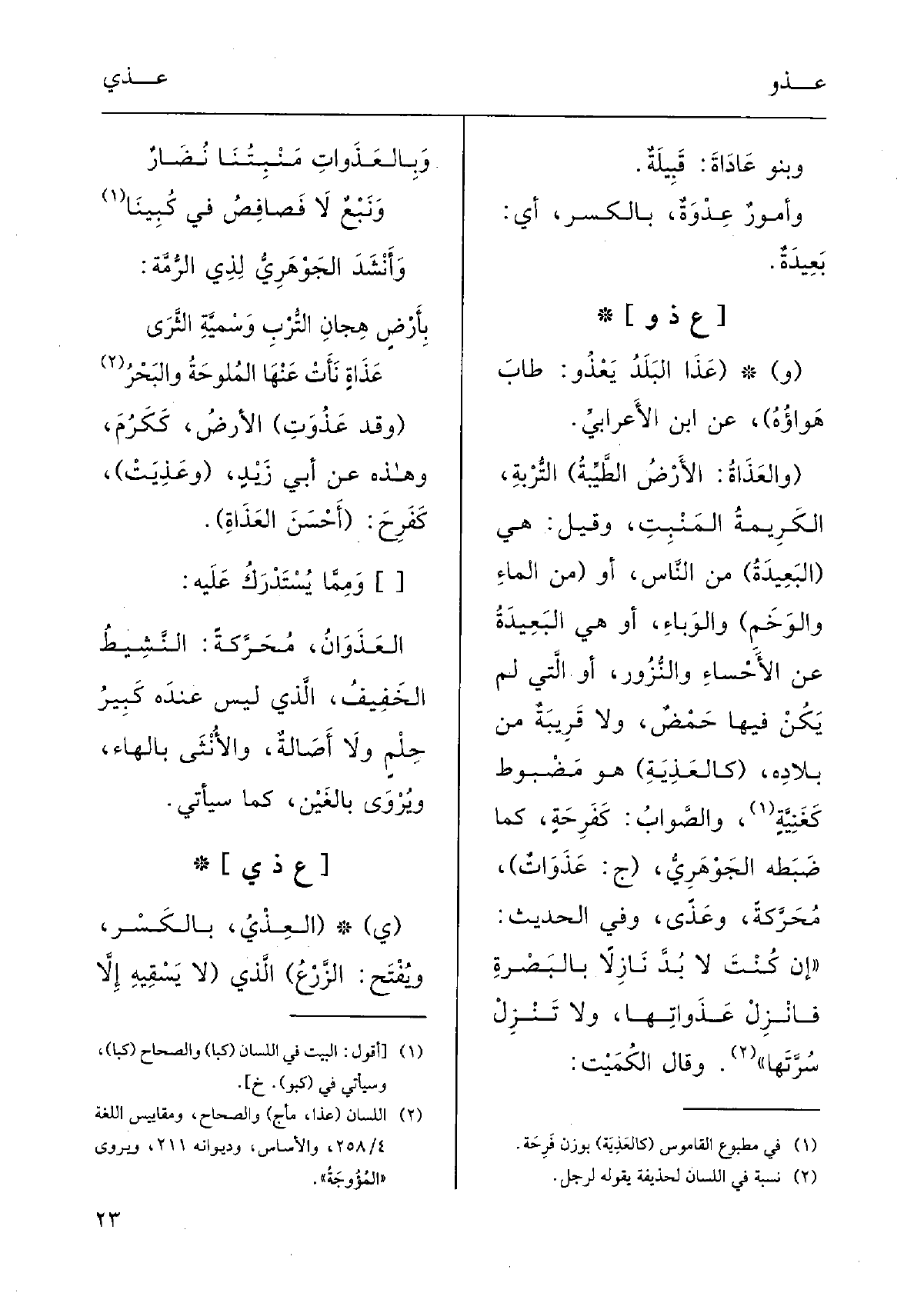 (وقيلَ: هِيَ (البَعِيدَةُ) مِن النَّاسِ، أَو (من الماءِ والوَخَمِ) والوَباءِ: أَو هِيَ البَعِيدَةُ عَن الأَحْساءِ والنُّزُورِ، أَو الَّتِي لم يكُنْ فِيهَا حَمْضٌ وَلَا قرِيبَة مِن بِلادِه. (كالعَذِيَّةِ،) هُوَ مَضْبوطٌ كغَنِيَّةٍ، والصَّوابُ كفَرِحَةٍ كَمَا ضَبَطَه الجوْهرِي، (ج} عَذَواتٌ،) محرَّكةً، {وعَذًى.