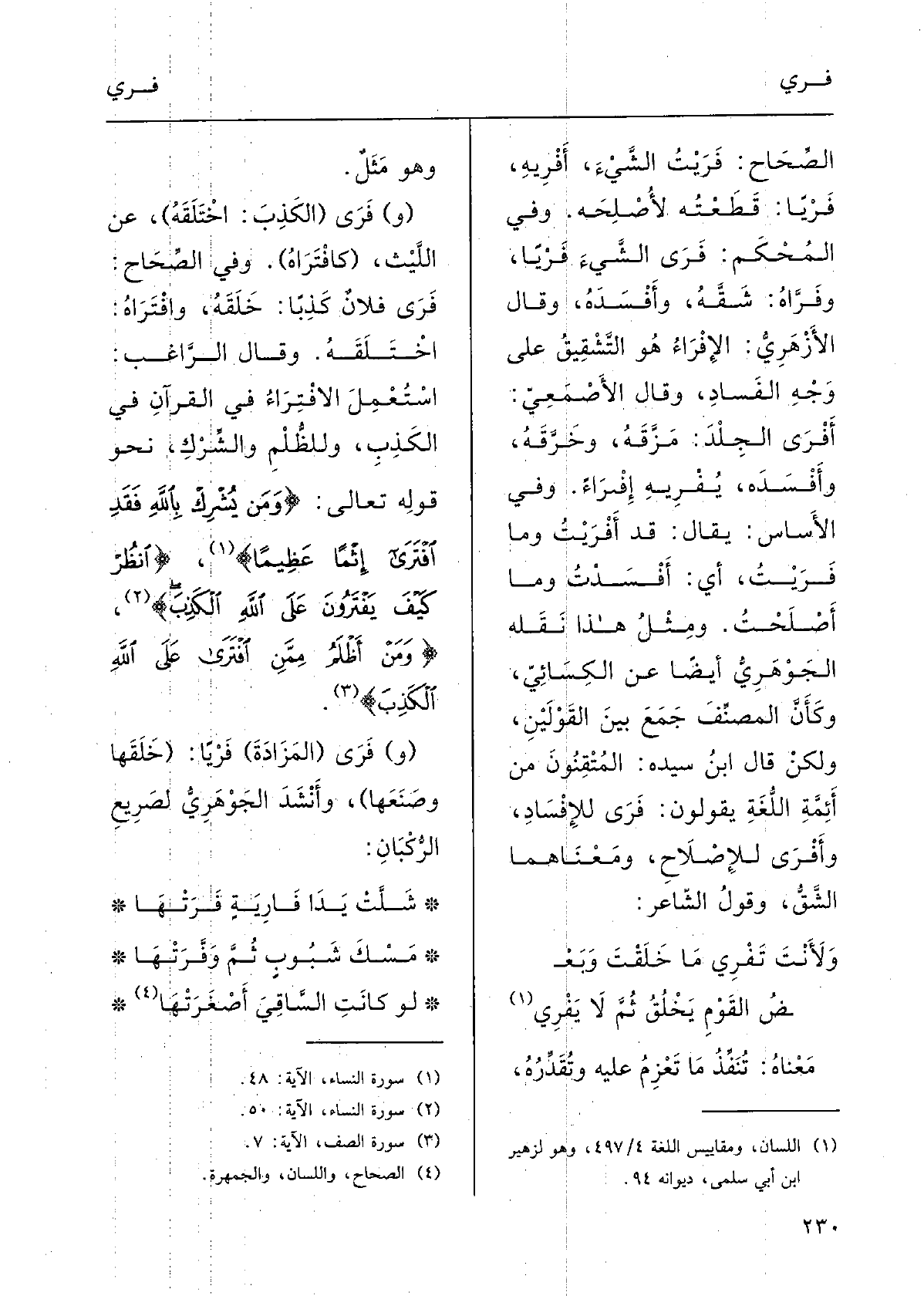 وَلَكِن قالَ ابنُ سِيدَه: والمُتْقنونَ مِن أَئِمَّة اللُّغَةِ يقولونَ: فَرَى للإفْسادِ، وأَفْرَى للإصْلاحِ، ومَعْناهُما الشّقّ؛ وقولُ الشاعرِ: