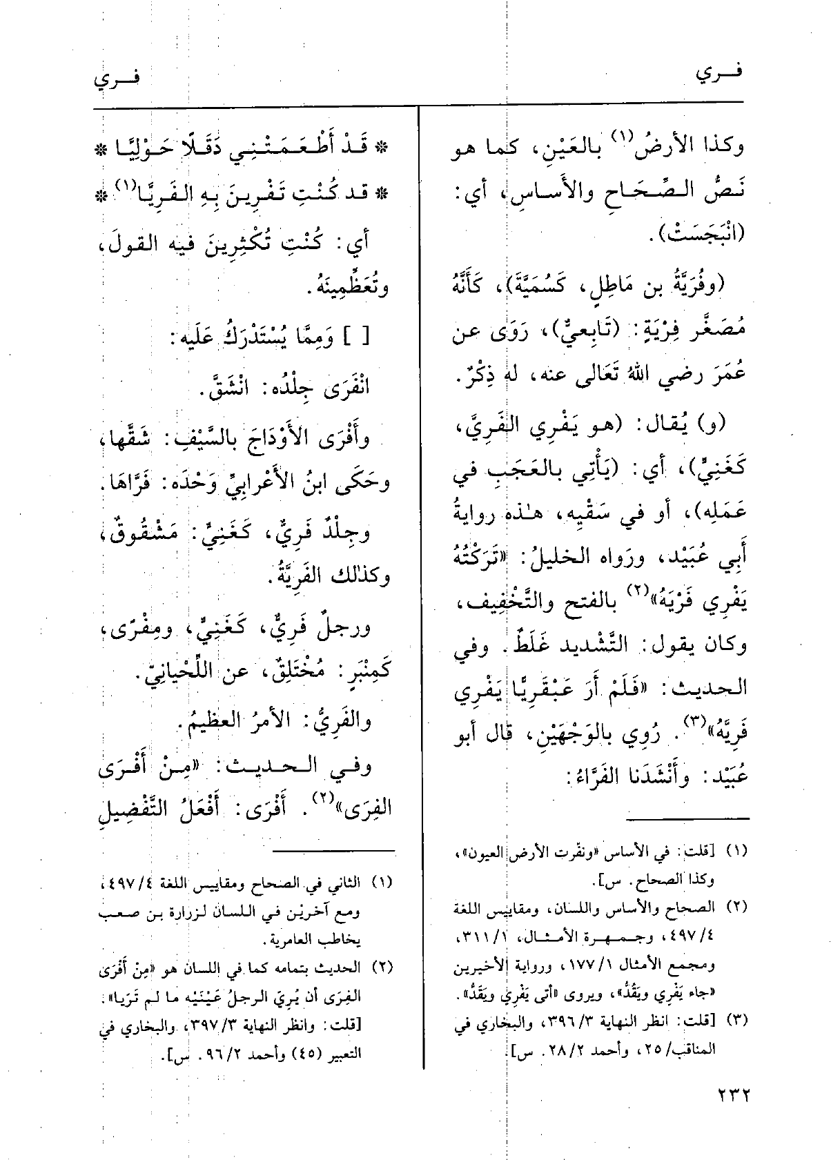 {والفَرِيُّ: الأمْرُ العَظيمُ. وَفِي الحديثِ: (مَنْ} أَفْرَى! الفِرَى) ؛ أَفْرَى: أَفْعَل التَّفْضِيل