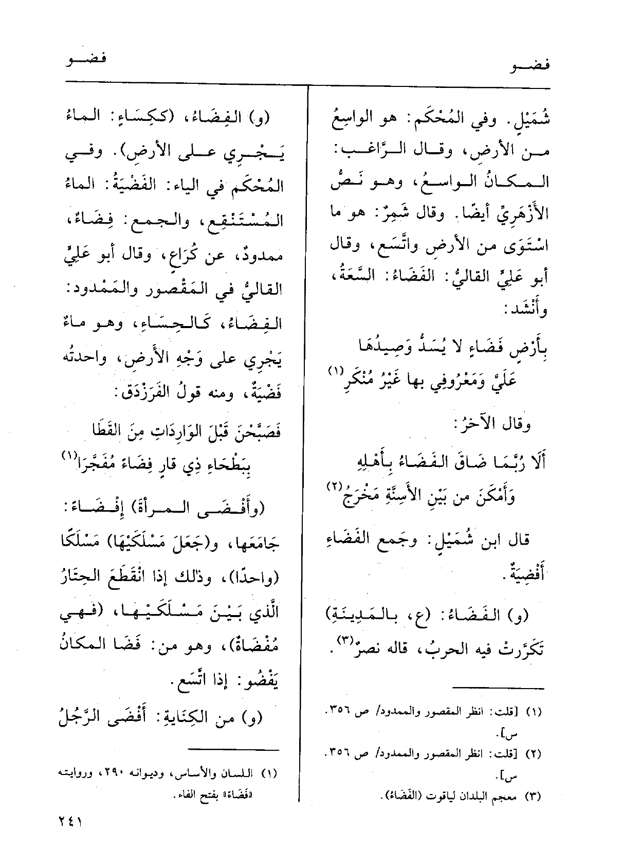 وقالَ أَبُو عليَ القالِي فِي المَقْصورِ والمَمْدودِ: الفِضاءُ، كالحِساءِ، وَهُوَ ماءٌ يَجْري على وَجْهِ الأرضِ، واحِدَتُه} فَضِيَّةٌ؛ وَمِنْه قولُ الفَرَزْدق: