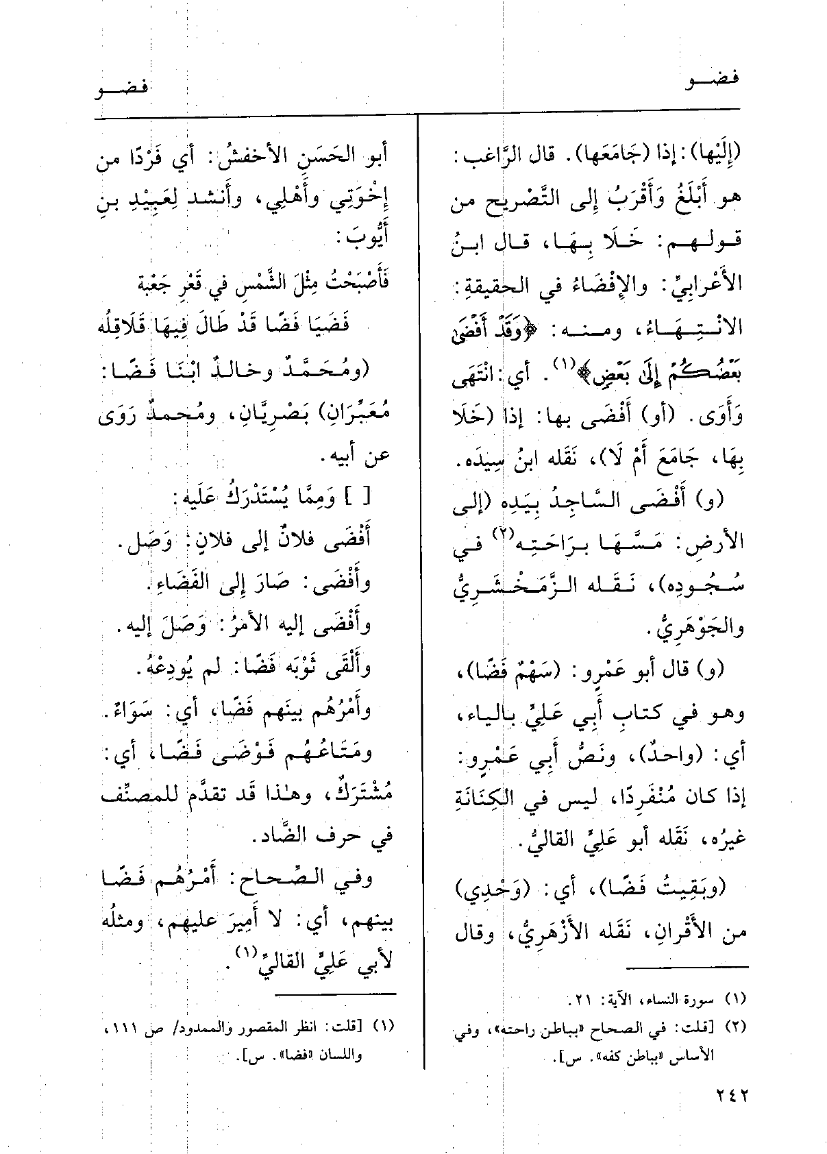 قالَ ابنُ الأعْرابي: {والإفْضاءُ فِي الحَقيقَةِ الانْتِهاءُ، وَمِنْه: وَقد أَفْضَى بعضُكُم إِلَى بعضٍ، أَي انتَهَى وأَوَى.