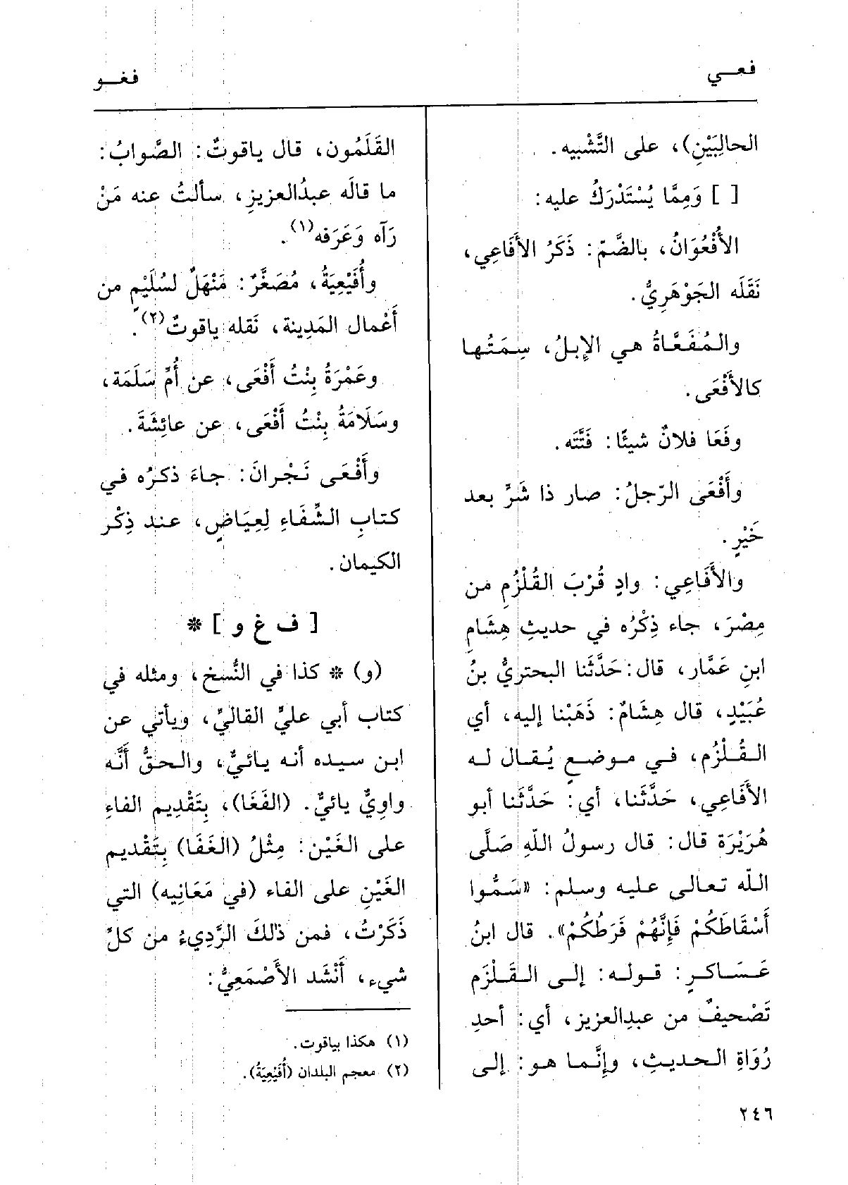 والأَفاعِي: وادٍ قُربَ القلزمِ مِن مِصْر، جاءَ ذِكْرُه فِي حديثِ هِشامِ بنِ عمَّار قالَ: حدَّثنا البُحْتري بنُ عُبيدٍ قالَ هِشام: ذَهَبْنا إِلَيْهِ، أَي القلزمَ، فِي موْضِعٍ يقالُ لَهُ الأفاعِي، حدَّثنا، أَي حدَّثنا أَبو هُرَيْرَةَ قالَ: قالَ رسُولُ اللَّهِ صلى الله عَلَيْهِ وَسلم (سمّوا أَسْقاطَكُم فإنَّهم فرطُكُم) .