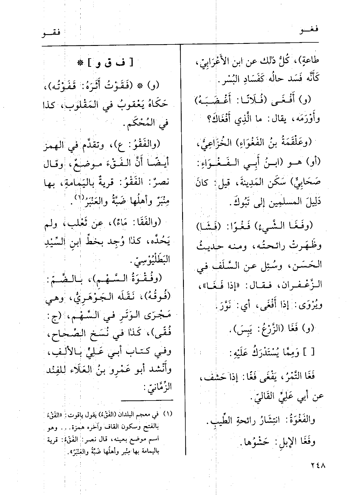 (} والفَقْوُ: ع) ، وتقدَّمَ فِي الهَمْزِ أَيضْاً أنَّ الفَقْءَ مَوْضِعٌ. وقالَ نَصْر: {الفَقْوُ قرْيَةٌ باليَمامَةِ بهَا منْبَرٌ، وأَهْلُها ضَبّة والغَنْبَر.
