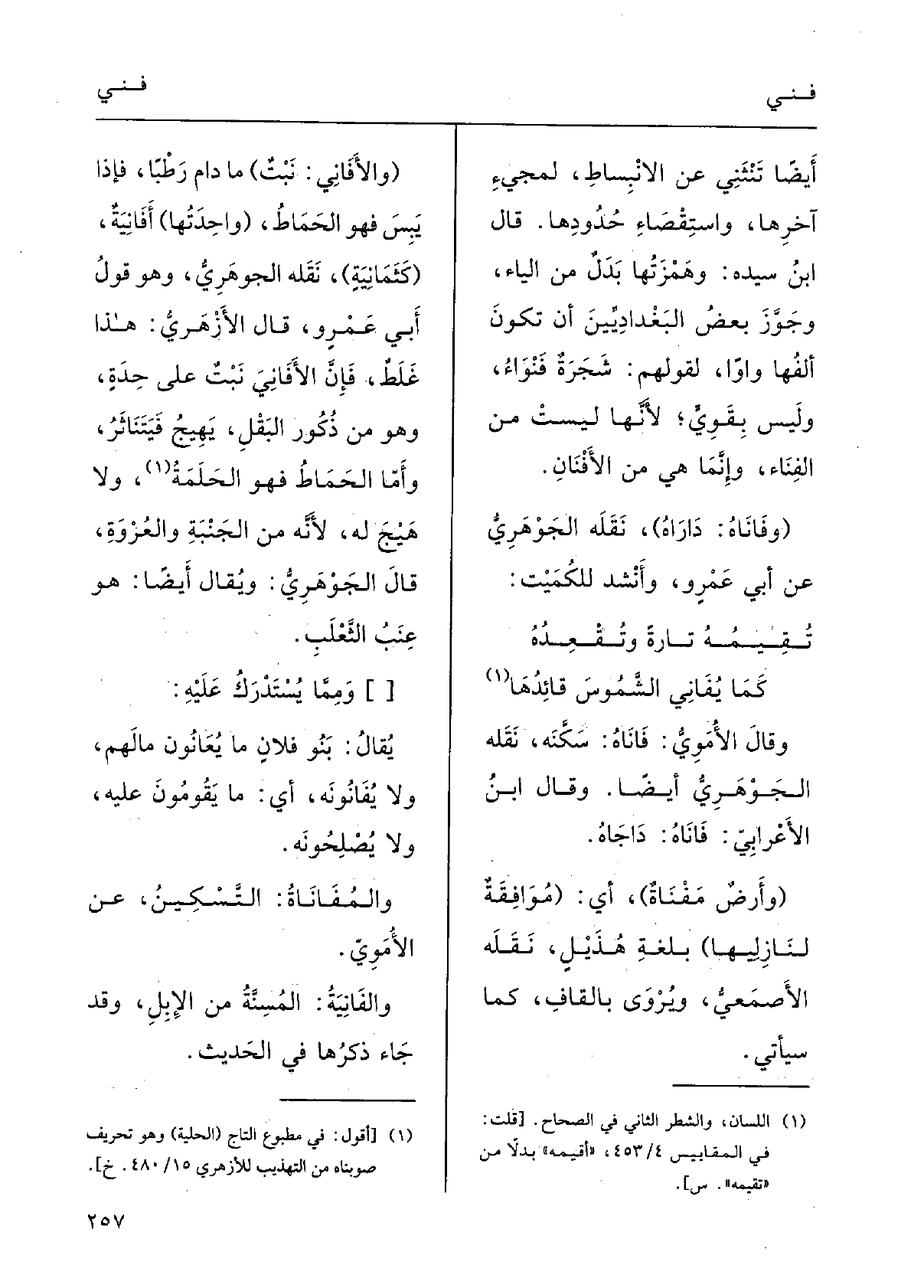 قالَ الأزْهرِي: هَذَا غَلَطٌ فإنَّ {الأفَانِيَ نَبْتٌ على حِدةٍ وَهُوَ مِن ذُكورِ البَقْلِ يَهِيجُ فيَتناثَرُ، وأَمَّا الحَماطُ فَهُوَ الحليةُ وَلَا هَيْجَ لَهُ لأنّه مِن الجنبةِ والعروَةِ.