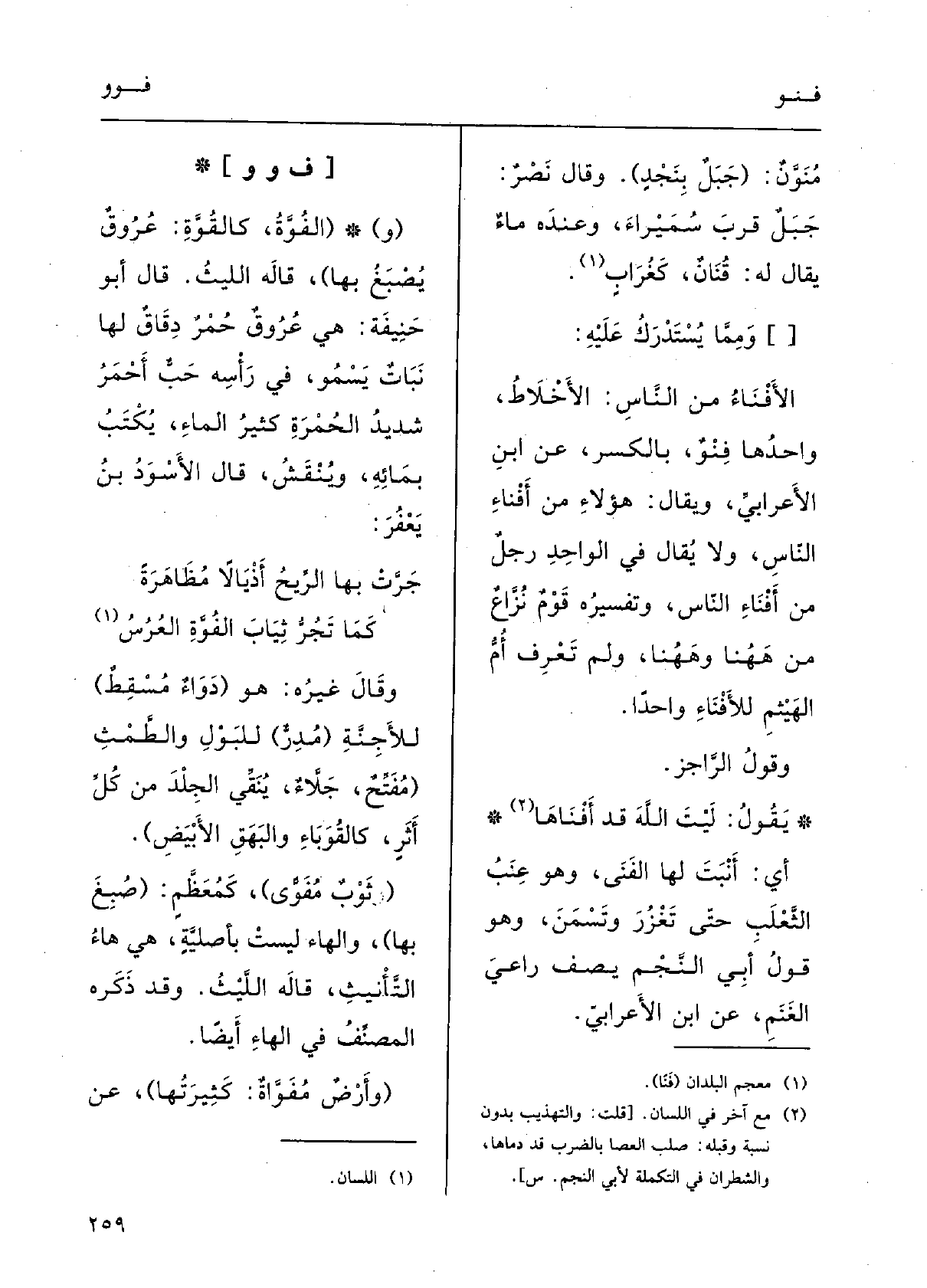 يقولُ لَيْتَ اللهَ قد {أَفْناها أَي أَنْبَتَ لَهَا} الفَنَى وَهُوَ عِنَبُ الثّعْلبِ حَتَّى تَغْرزَ وتَسْمَنَ. وَهُوَ قولُ أبي النّجْم يَصِفُ راعِيَ الغَنَم؛ عَن ابنِ الْأَعرَابِي.