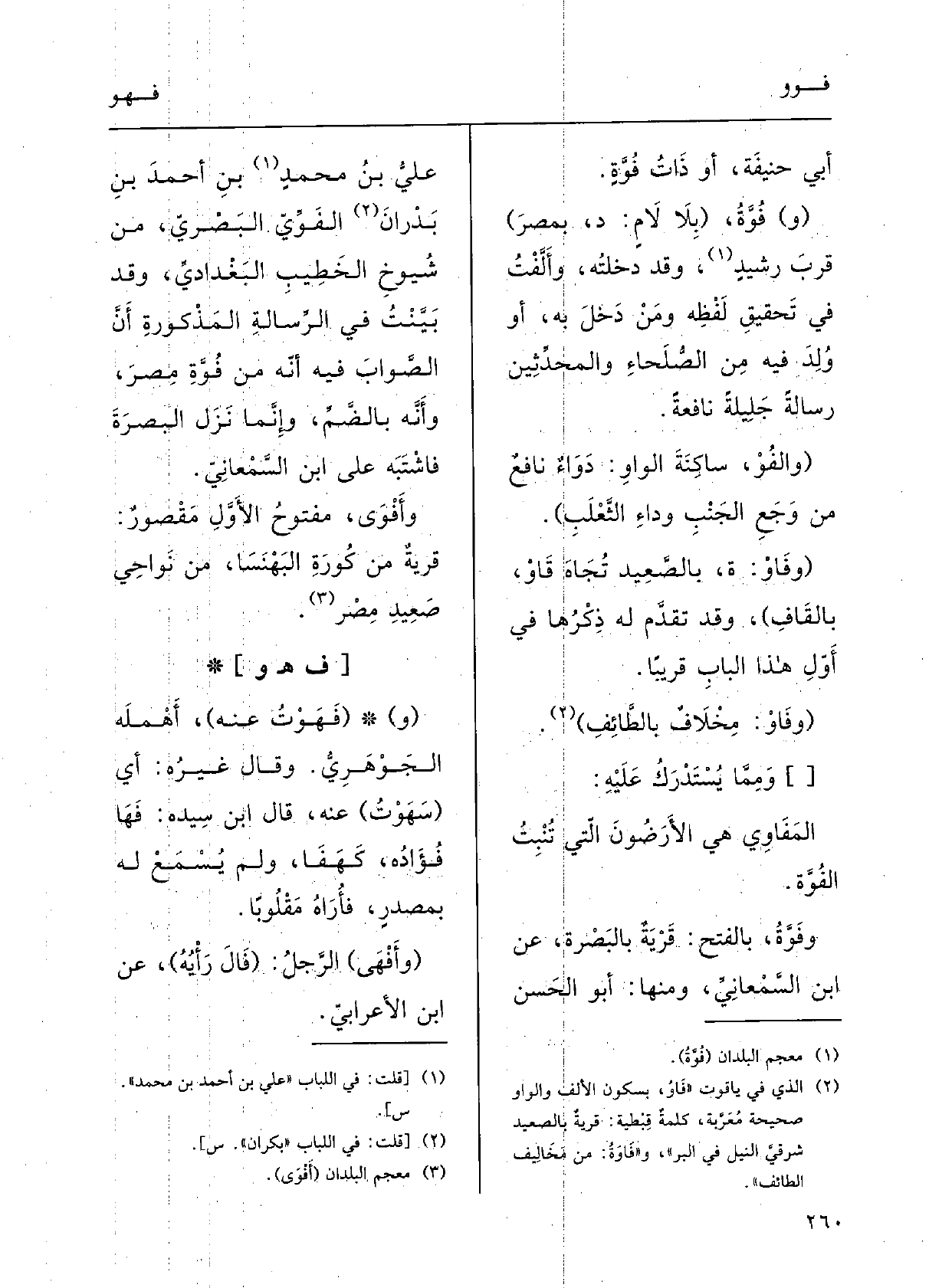 ( {وفَوَّةُ، بالفَتح: قَرْيَةٌ بالبَصْرَةِ، عَن ابنِ السّمعاني؛ وَمِنْهَا: أَبو الحَسَنِ عليُّ بنُ محمدِ بنِ أَحمدَ بنِ بَدْران} الفَوّيُّ البَصْريُّ من شيوخِ الخطيبِ البَغْدادِي. وَقد بَيَّنْت فِي الرِّسالَةِ المَذْكورَةِ أَنَّ الصَّوابَ فِيهِ أَنَّه مِن فُوَّةِ مِصْر، وأَنَّه بالضمِّ، وإنَّما نَزَلَ البَصْرَةَ فاشْتُبِه على ابنِ السَّمعاني.