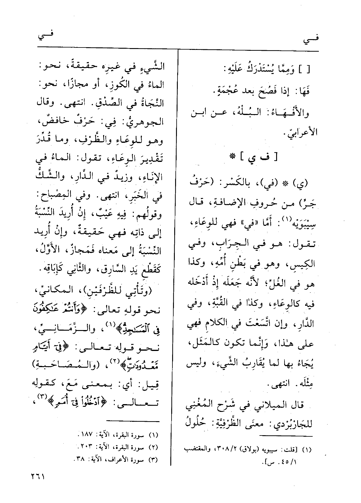 قالَ سِيْبَوَيْه: أَمَّا فِي فَهِيَ للوِعاءِ، تقولُ: هُوَ فِي الجِرابِ وَفِي الكِيسِ، وَهُوَ فِي بَطْنِ أمِّه؛ وَكَذَا هُوَ فِي الغُلِّ لأنَّه جَعَلَه إِذا أَدْخَلَه فِيهِ كالوِعاءِ، وَكَذَا فِي القُبَّةِ {وَفِي الدّارِ، وَإِن اتّسَعْتَ فِي الكَلامِ فَهِيَ على هَذَا، وإنّما تكونُ كالمَثَل يُجاءُ بهَا لمَا يُقارِبُ الشَّيْء، وليسَ مِثْله، انتَهَى.