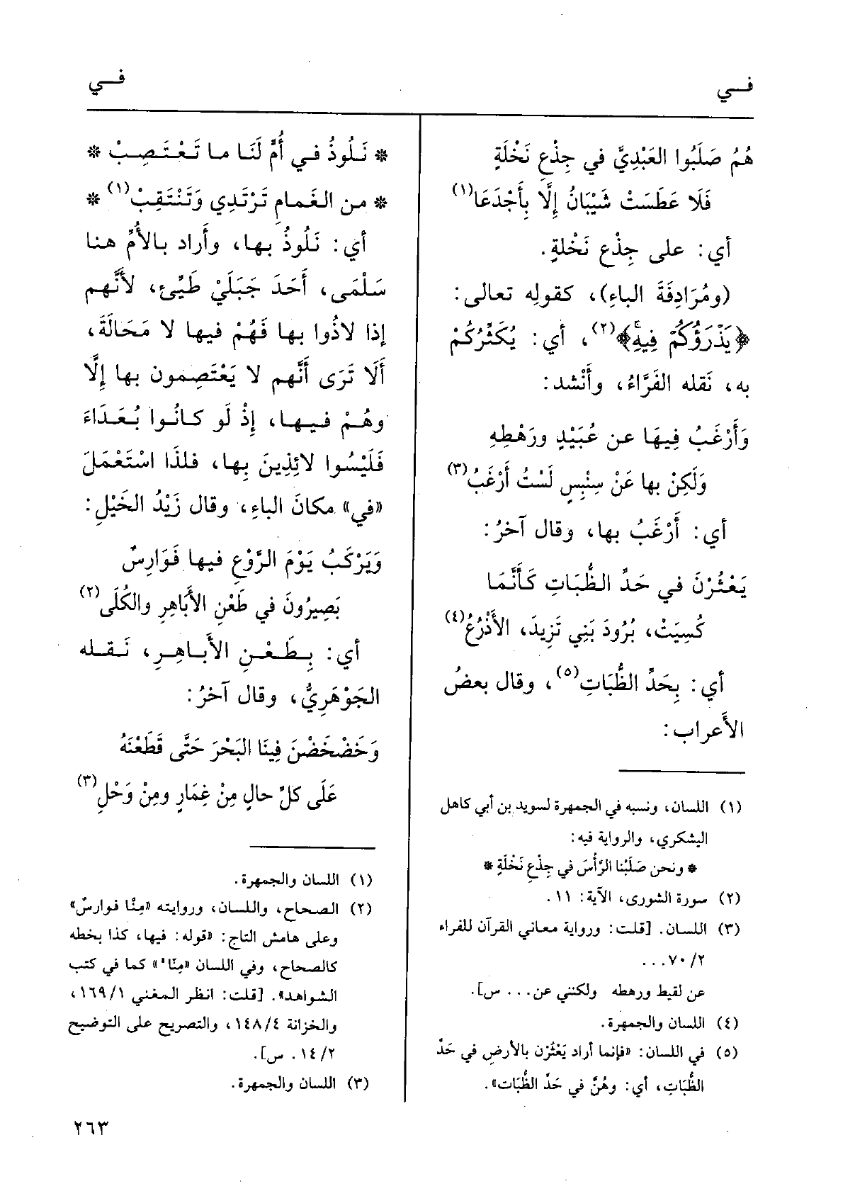 من الغِمامِ تَرْتَدِي وتَنْتَقِبْأَي نَلُوذُ بهَا. وأَرادَ بالأُمِّ هُنَا سَلْمى أَحَد جَبَلي طَيِّىءٍ لأنَّهم إِذا لاذُوا بهَا فهُم فِيهَا لَا مَحالَةَ، أَلاَ تَرَى أَنَّهم لَا يَعْتَصِمُون بهَا إلاَّ وهُم فِيهَا؟ إِذْ لَو كَانُوا بُعَداء فليْسُوا لائِذِين بهَا فَلِذَا اسْتُعْمِل فِي مكانِ الباءِ؛ وقالَ زَيْدُ الخَيْل: