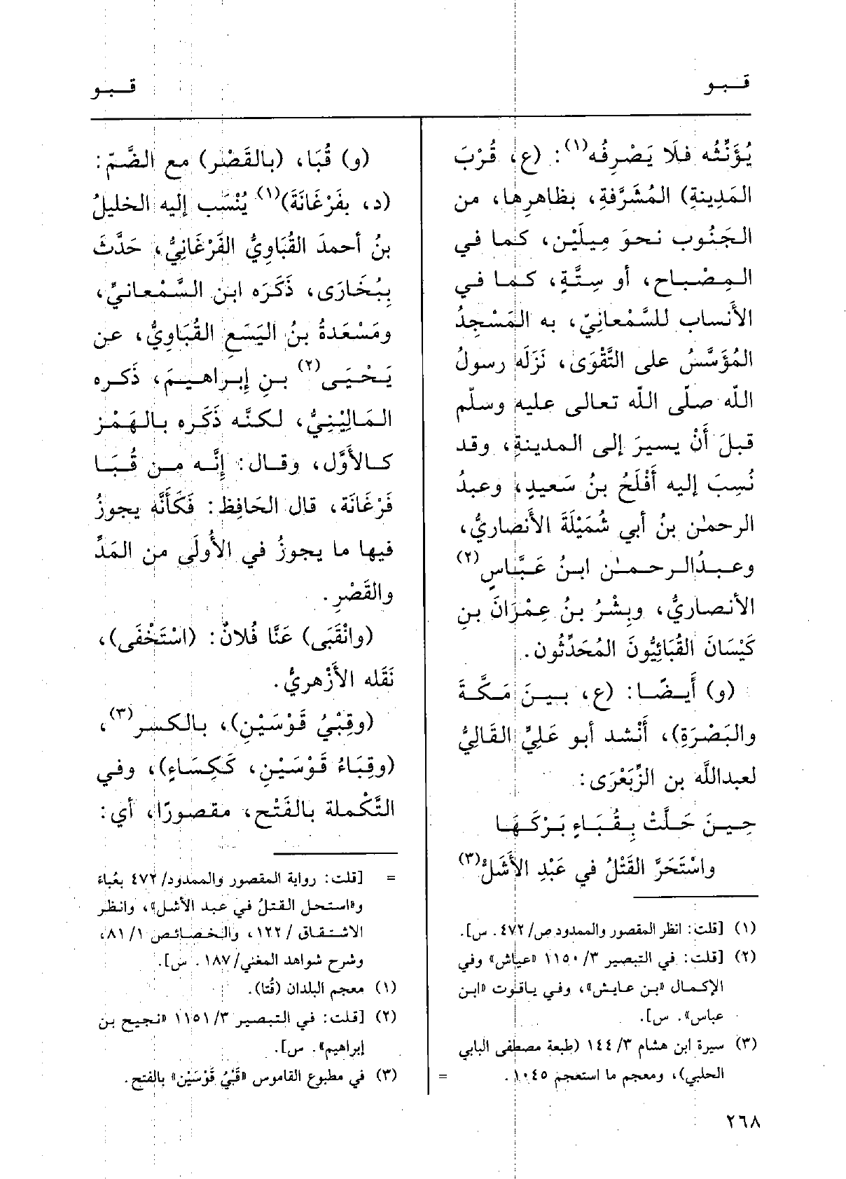 واستحرَّ القَتْل فِي عبدِ الأَشَل (و) {قُبَا، (بالقَصْرِ) مَعَ الضَّمِّ: (د بفَرْغانَةَ) يُنْسَبُ إِلَيْهِ الخلِيلُ بنُ أَحمدَ} القُباوِيُّ الفَرْغانيُّ حدَّثَ ببُخارَى، ذَكَرَه ابنُ السَّمعاني؛ ومسعدَةُ بنُ اليسع القُبَاوِيُّ عَن يَحْيى ابنِ إِبْرَاهِيم، ذَكَرَه المَالِينِي لكنَّه ذَكَره بالهَمْزِ كالأوّلِ وقالَ: إنَّه من قُبا فَرْغانَةَ؛ قالَ الحافِظُ: فكأَنَّه يجوزُ فِيهَا مَا يجوزُ فِي الأولى مِن المدِّ والقَصْر.