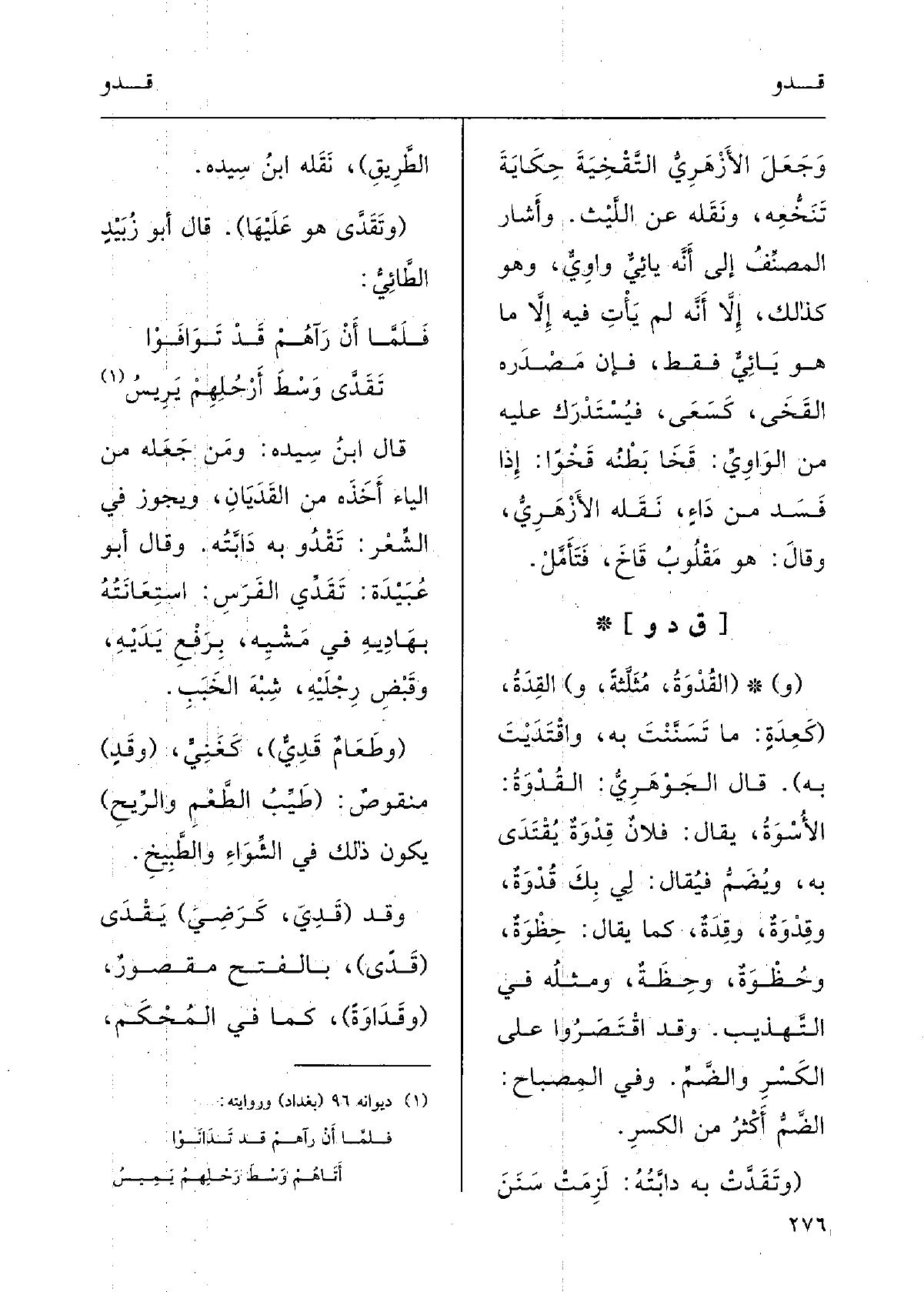 {تَقَدَّى وسطَ أَرْحلهم يَرِيسُقالَ ابنُ سِيدَه: ومَنْ جَعَلَه مِن الياءِ أَخَذَه من} القَدَيانِ، ويَجوزُ فِي الشِّعْر {تقدُو بِهِ دابَّتُه.