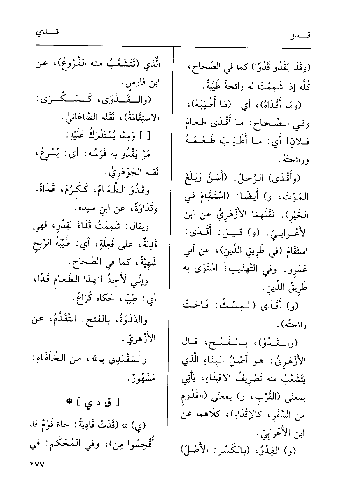 ( {والقَدْوُ) ، بالفَتْح؛ قالَ الأزْهَري: هُوَ أَصْلُ البِناءِ الَّذِي يَتَشعَّب مِنْهُ تَصْريفُ} الاقْتِداء يأْتِي بمعْنَى (القُرْبِ، و) بمعْنَى (القُدُومِ مِن السَّفَرِ، {كالإقْداءِ) ، كِلاهُما عَن ابنِ الأعْرابي.