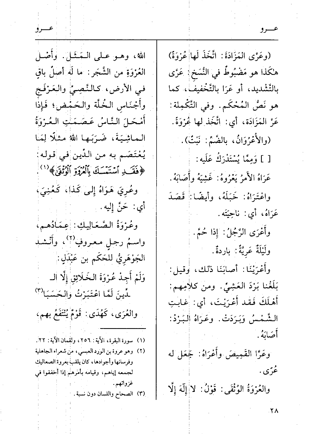 وأَصْلُ العُرْوَةِ مِن الشَّجَرِ: مَا لَهُ أَصْلٌ باقٍ فِي الأرْضِ كالنَّصِيِّ والعَرْفَج وأَجْناسِ الخُلَّة والحَمْضِ، فَإِذا أَمْحَلَ الناسُ عَصَمت العُرْوَةُ الماشِيَةُ؛ ضَرَبَها اللَّهُ مَثَلاً لمَا يُعْتَصَم بهِ مِن الدِّين فِي قوْلِهِ؛ {فقد اسْتَمْسَكَ} بالعُرْوَةِ الوُثْقَى} .