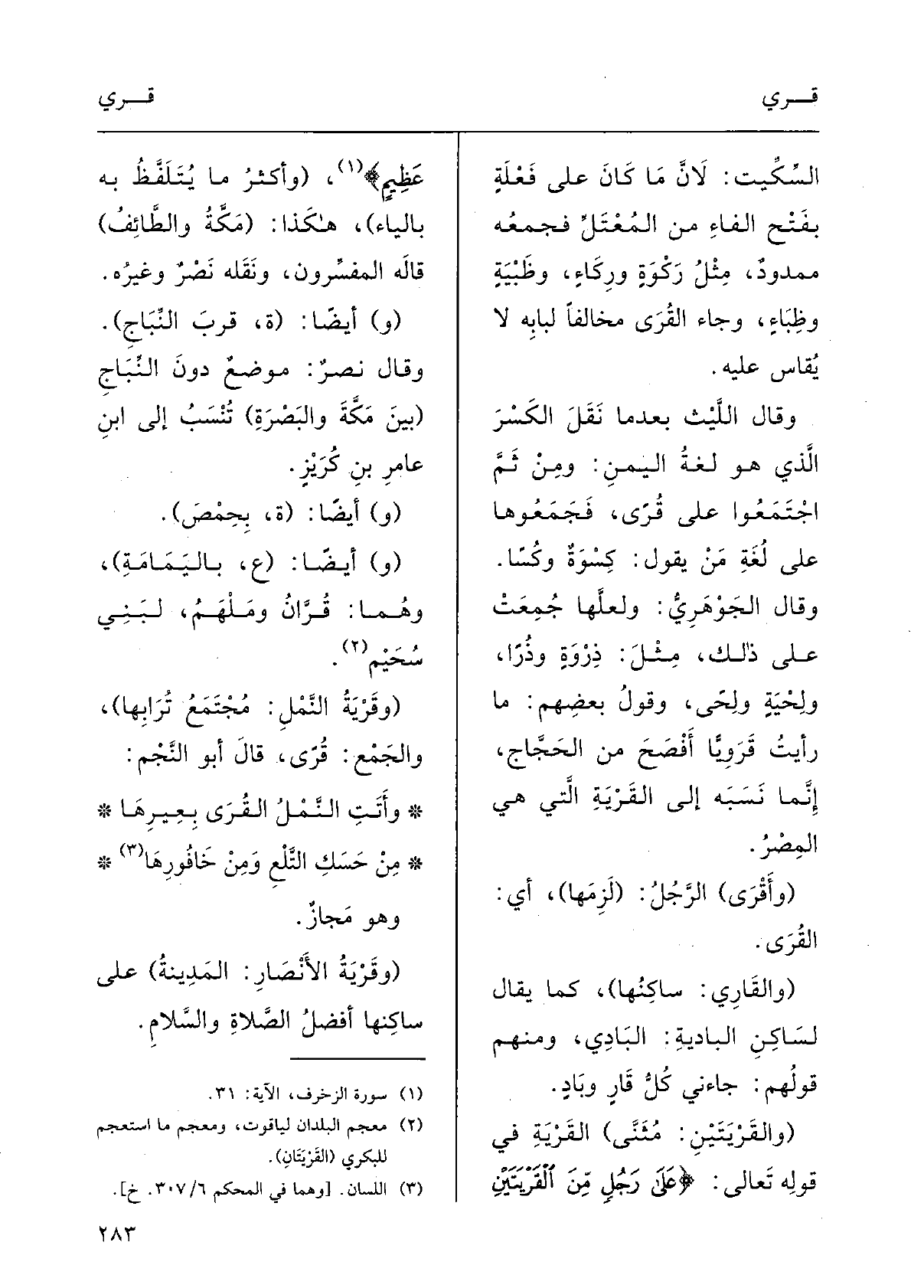( {والقَرْيَتَيْن، مُثَنَّى) القَرْيةِ فِي قولِه تَعَالَى: {إِلَى رجُلٍ مِن} القَرْيَتَيْن عظِيمٍ} . (وأَكْثَرُ مَا يُتَلَفَّظُ بِهِ بالياءِ) ، هَكَذَا: (مكَّةُ والطَّائِفُ) ؛) قالَهُ المفسِّرُونَ، ونقلَهُ نَصْرٌ وغيرُهُ.