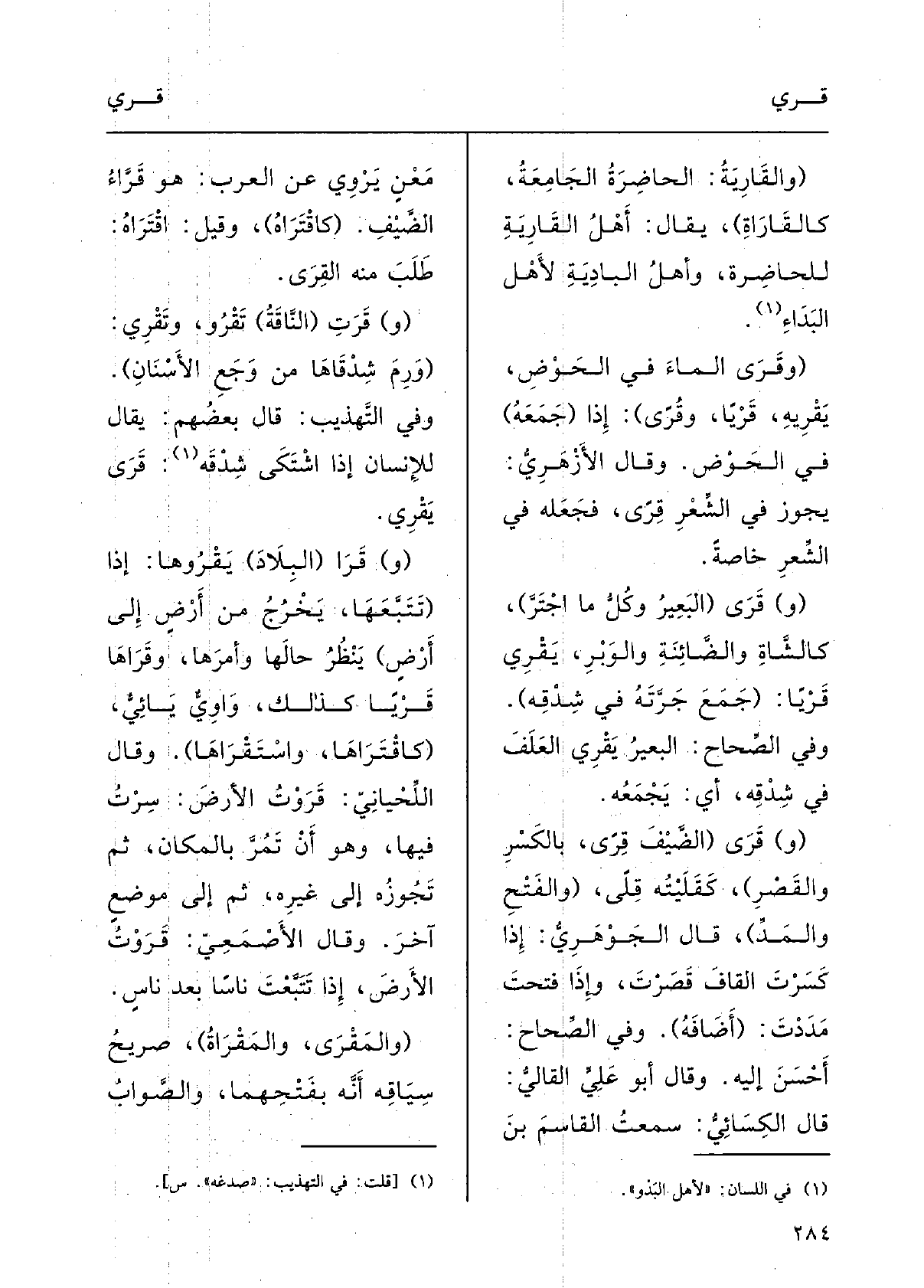 وقالَ الأزْهرِي: يَجوزُ فِي الشِّعْرِ} قِرًى فجعَلَهُ فِي الشِّعْر خاصَّةً.