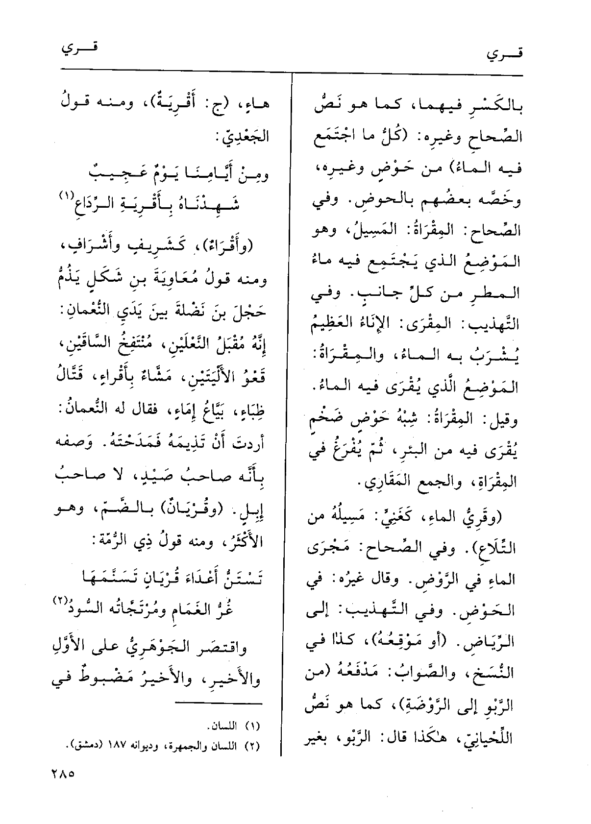 شَهِدْناهُ} بأَقْرِيةِ الرّداعِ ( {وأَقْراءٌ) ، كشَريفٍ وأَشْرافٍ؛ وَمِنْه قولُ مُعاوِيَةَ بنِ شَكَل يذمُّ حَجْل بنَ نَضْلَةَ بينَ يَدَي النُّعْمان: إنَّه مُقْبَلُ النَّعْلينِ مُنْتَفِخُ الساقَيْنِ قَعْو الأَلْيَينِ مَشَّاءُ} بأَقْراءٍ قَتَّالُ ظِباءٍ بَيَّاعُ إماءٍ؛ فقالَ لَهُ النّعْمان: أَرَدْتَ أَن تَذِيمَه فمدحته، وَصَفَه بأنَّه صاحِبُ صَيْدٍ لَا صاحِبَ إِبِلٍ.