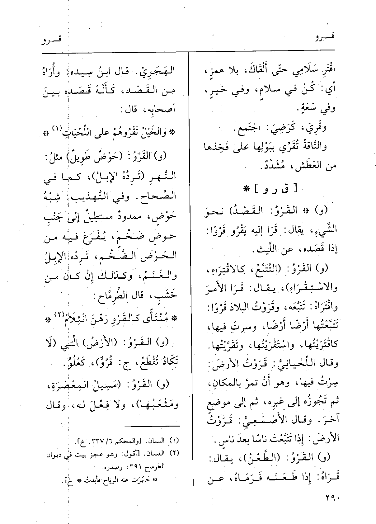: (و (} القَرْوُ: القَصْدُ) نَحْو الشَّيء. يقالُ: {قَرَا إِلَيْهِ} يَقْرُو {قَرْواً، إِذا قَصَدَه؛ عَن اللّيْثِ.