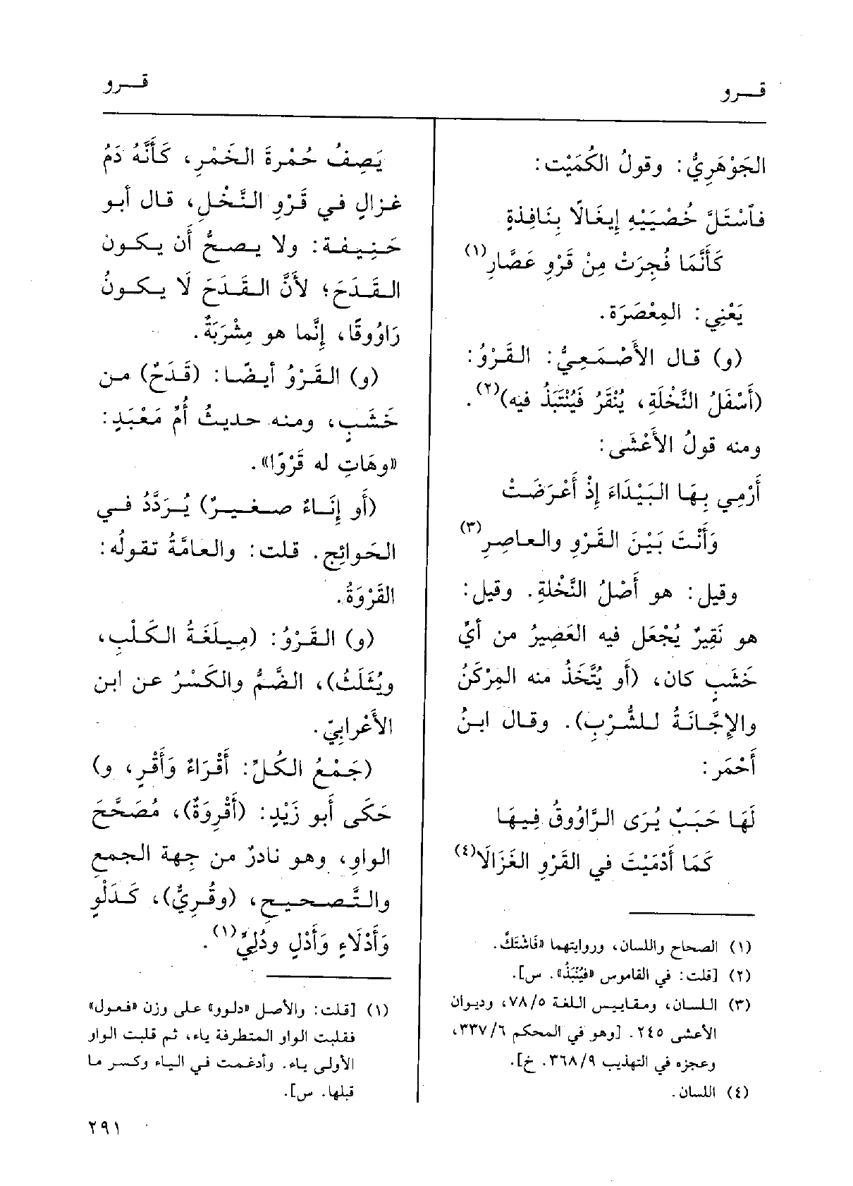 وأَنْتَ بَيْنَ القَرْوِ والعاصِرِوقيلَ: هُوَ أَصْلُ النَّخلة؛ وقيلَ: هُوَ نَقِيرٌ يُجْعَل فِيهِ العَصِيرُ مِن أَيِّ خَشَبٍ كانَ، (أَو يُتَّخَذُ مِنْهُ المِرْكَن، والإجَّانَةُ للشُّرْبِ) ؛) وقالَ ابنُ أَحْمر: