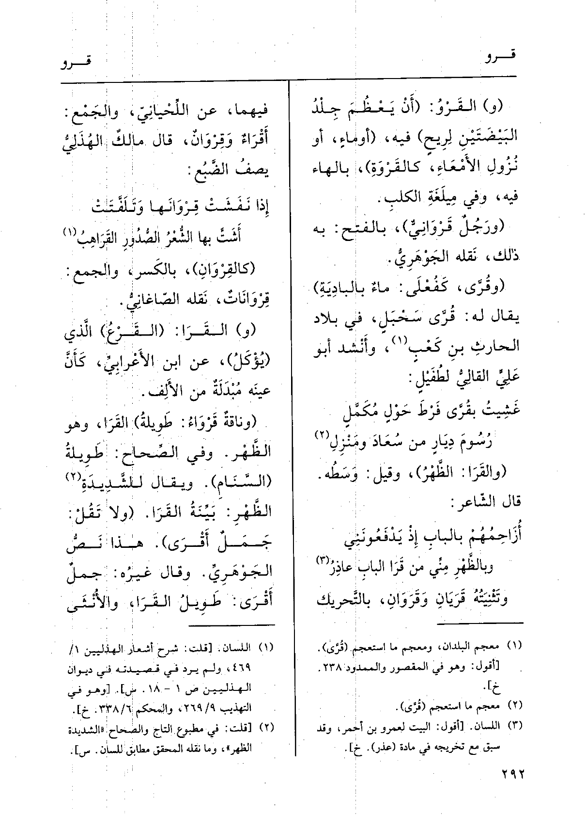 رسومِ دِيَارٍ من سُعادٍ ومَنْزِلِ (} والقَرَا: الظَّهْرُ) ؛) وقيلَ: وَسَطُه؛ قالَ الشاعِرُ: