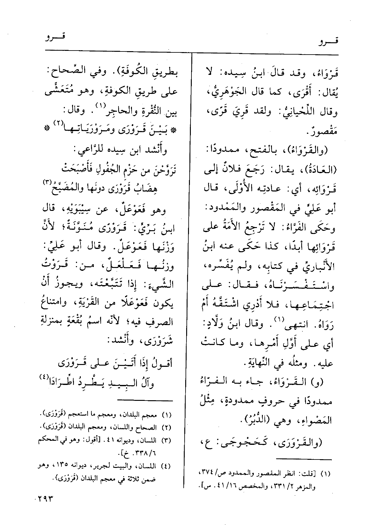 وقالَ أَبو عليَ وزْنُها فَعَلْعَل مِن! قَرَوْتُ الشيءَ إِذا تَتَبَّعْته، ويجوزُ أَنْ يكونَ فَعَوْعَلاً من القَرْية، وامْتِناعُ الصَّرْف فِيهِ لأنَّه اسْمُ بُقْعة بمنْزلَةِ شَرَوْرَى؛ وأَنْشَدَ: