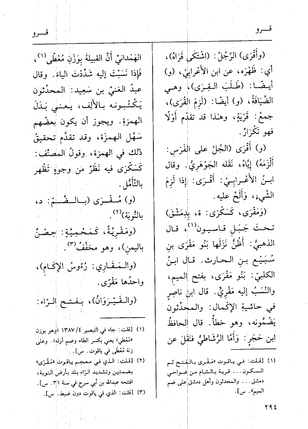 ( {ومَقْرَى، كسَكْرَى: بدِمَشْقَ) تحْتَ جَبَلِ قاسِيُون؛ قالَ الذَّهبيُّ: أَظنُّ نَزَلَها بَنُو} مُقْرَى بنِ سُبَيْع بنِ الحارِثِ؛ قالَ ابنُ الكَلْبي: بَنُو مَقْرِي، بفَتْح الميمِ، والنَّسَبُ إِلَيْهِ {مَقْرِيٌّ؛ قالَ ابنُ ناصِر فِي حاشِيةِ الإكْمالِ: والمحدِّثُونَ يضمُّونَه وَهُوَ خَطَأٌ؛ قالَ الحافِظُ ابنُ حَجَر: وأَمَّا الرّشاطي فنَقَلَ عَن الهَمَداني أنَّ القَبيلَةَ بوزْنِ مُعْطِي، فَإِذا نَسَبْتَ إِلَيْهِ شَدَدْتَ الْيَاء؛ وقالَ عبدُ الغَنِي بنُ سعيدٍ: المحدِّثُونَ يَكْتبُونَه بالألِفِ يَعْني بدَلَ الهَمْزةِ، ويجوزُ أنْ يكونَ بعضُهم سهَّلَ الهَمْزةَ، وَقد تقدَّمَ تَحقِيقُ ذلكَ فِي الهَمْزةِ.