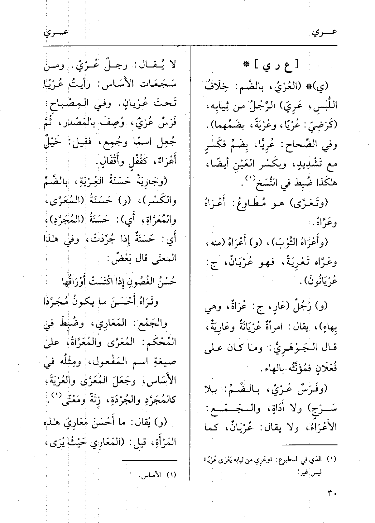 وتَرَاهُ أَحْسَن مَا يكونُ مَجَرَّداوالجَمْعُ ا {لمَعارِي، وضُبِطَ فِي المُحْكم: المُعَرَّى والمُعَرَّاة، على صِيغَةِ اسْمِ المَفْعولِ، ومِثْلُه فِي الأساسِ. وجعلَ المُعَرَّى} والعُرْيَة كالمُجرَّدِ والجُرْدَةِ زِنَةً ومَعْنًى.
