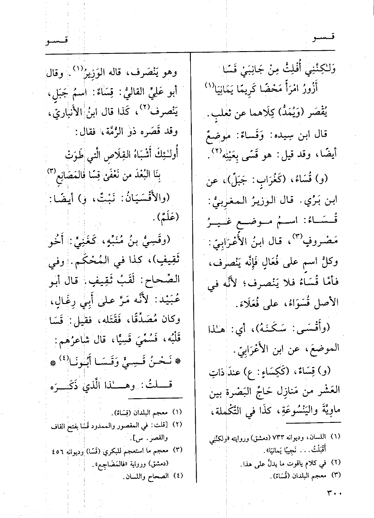 قالَ الوَزيرُ المَغْربي: قُساءُ اسْمُ موضِعٍ، غيْرُ مَصْروفٍ.