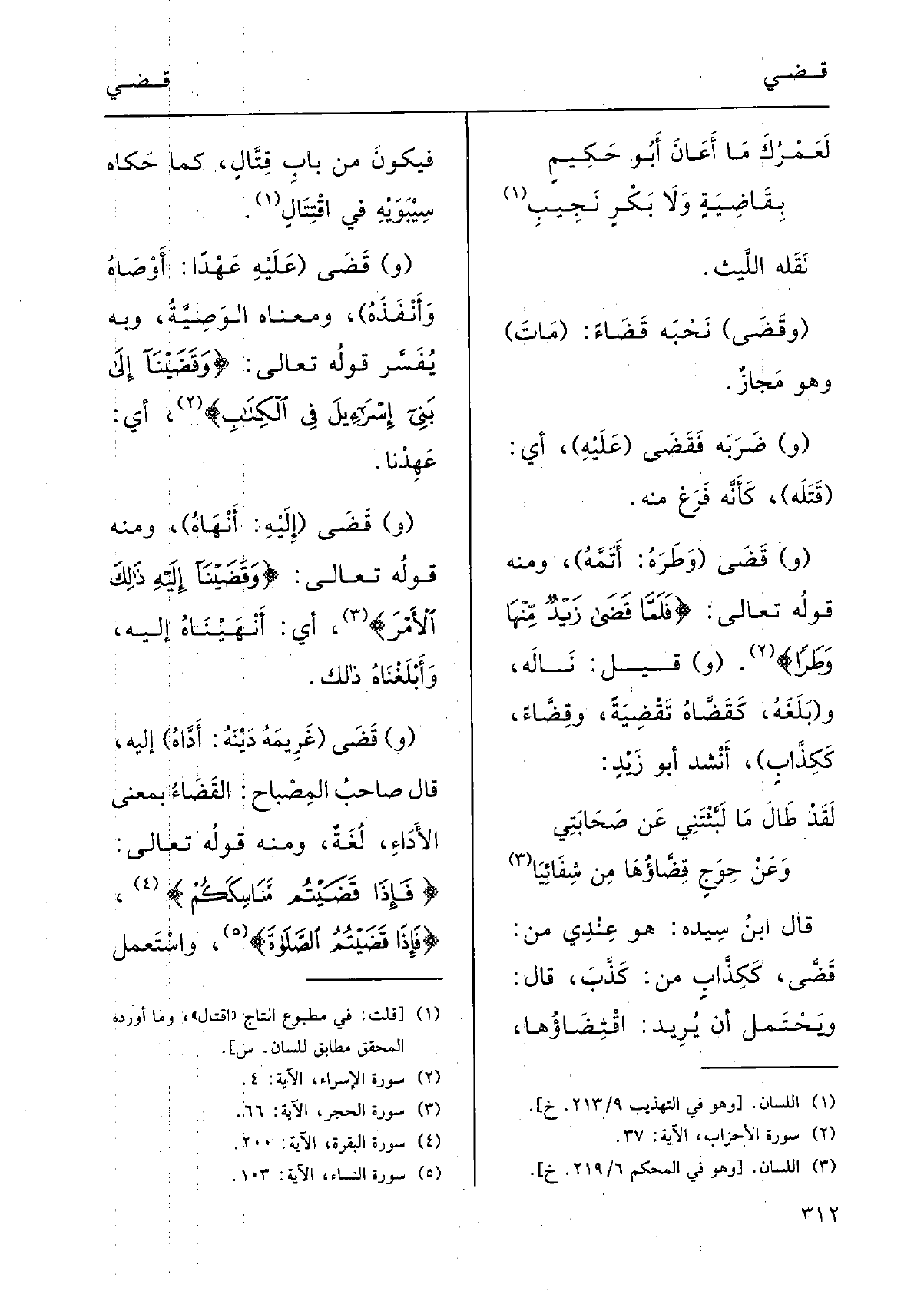 قالَ صاحِبُ المِصْباح:} القَضاءُ بمعْنَى الأدَاءِ لُغَةٌ؛ وَمِنْه قولُه تَعَالَى: {فَإِذا! قَضَيْتُم مَناسِكَكُم} ، {فَإِذا قَضَيْتم الصَّلاة} ؛ واسْتَعْمَل
