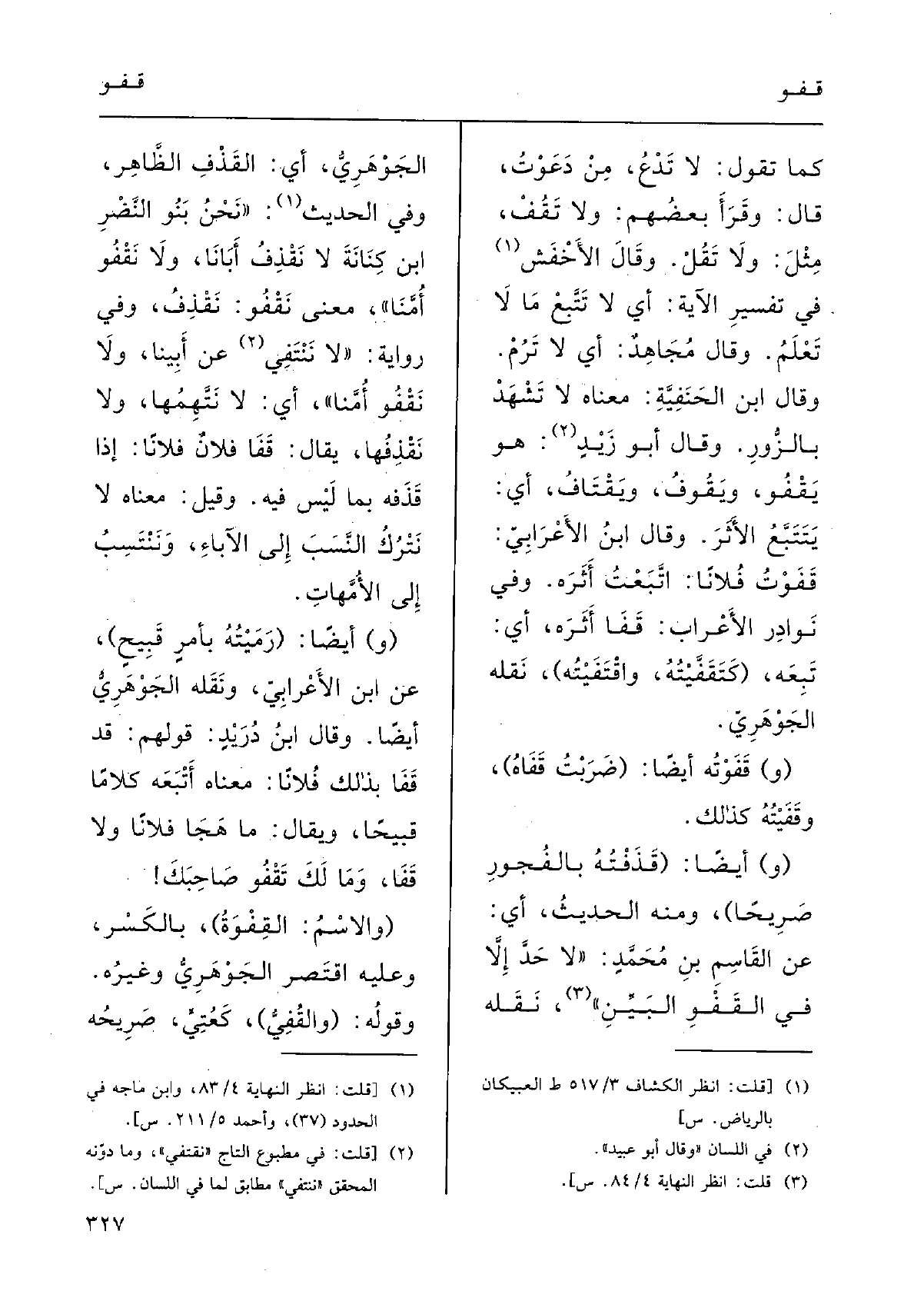 وَفِي الحديثِ: (نحنُ بَنُو النَّضْر بنِ كِنانَةَ لَا نَقْذِفُ أَبانا وَلَا نَقْفُو أُمَّنا) ، مَعْنى نَقْفُو نَقْذِفُ؛ وَفِي رِوايَةٍ: لَا نقتفي عَن أَبِينا وَلَا {نَقْفُو أُمَّنا، أَي لَا نَتَّهِمُها وَلَا نَقْذفُها. يقالُ: قَفَا فلانٌ فلَانا إِذا قَذَفَه بِمَا ليسَ فِيهِ؛ وقيلَ: مَعْنَاهُ لَا نَتْركُ النَّسَبَ إِلَى الآباءِ، ونَنْتَسِب إِلَى الأُمَّهات.