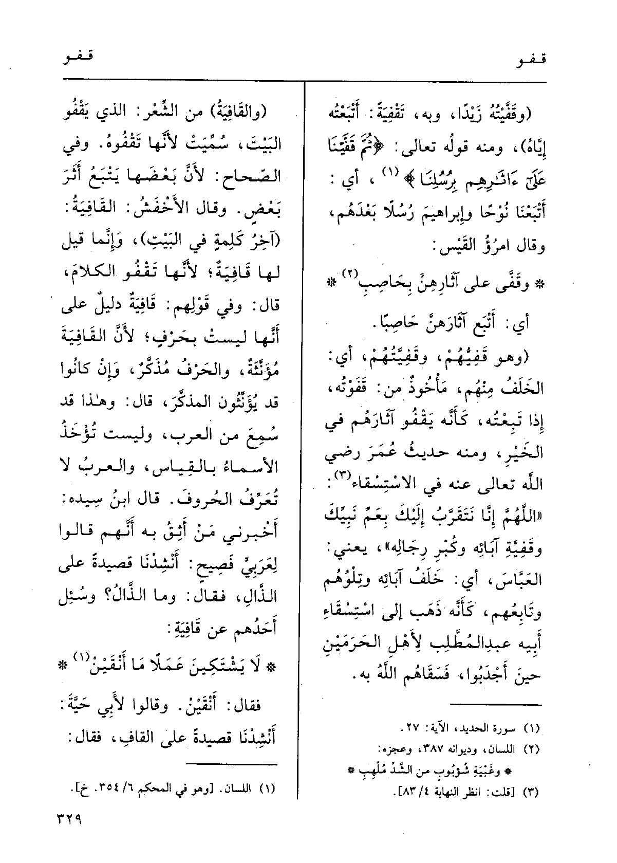 ( {وقَفَّيْتُه زَيْدًا، وَبِه} تَقْفِيَةً: أَتْبَعْتُه إِيَّاهُ) ؛) وَمِنْه قولُه تَعَالَى: {ثمَّ {قَفَّينا على آثارِهِم برُسُلنا} ، أَي أَتْبَعْنا نوحًا وإبْراهيم رُسُلاً بعْدَهم؛ وقالَ امرؤُ القَيْس: