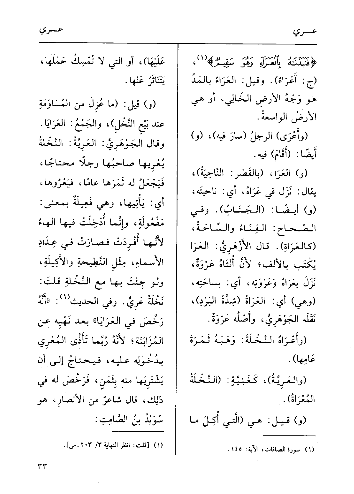 وَفِي الحديثِ: أَنَّه رَخَّصَ فِي العَرايَا بَعْدَ نَهْيِه عَن المُزَابَنَةِ، لأنَّه رُبَّما تَأَذَّى المُعَرّي بدُخُولِهِ عَلَيْهِ فيَحْتاجُ إِلَى أَن يَشْتَرِيَها مِنْهُ بثمنٍ فرُخّص لَهُ فِي ذلكَ؛ قالَ شاعرٌ مِن الأنْصارِ، هُوَ سُوَيْدُ بنُ الصامِتِ: