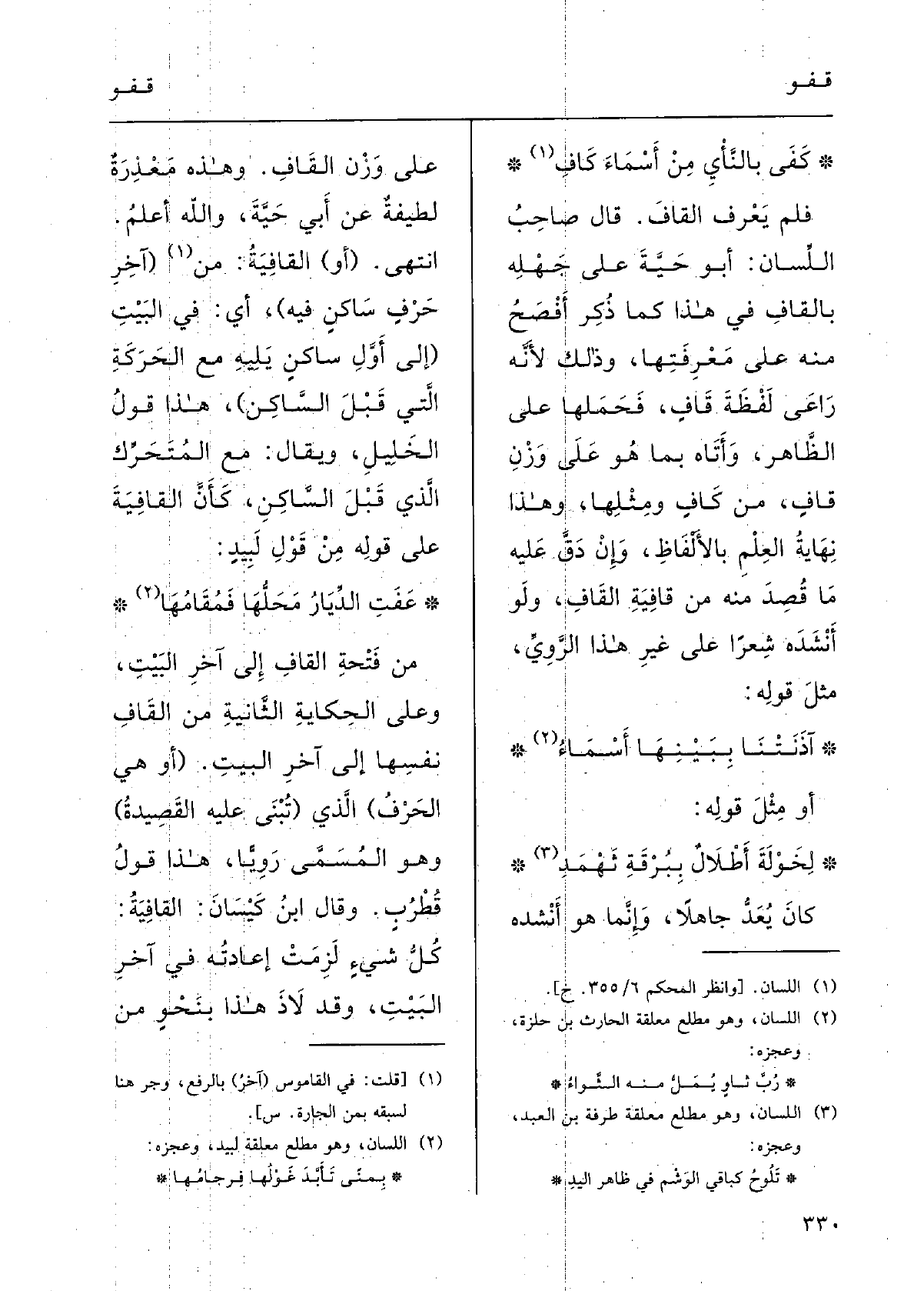 وقالَ ابنُ كَيْسان: القافيَةُ كلُّ شيءٍ لَزِمت إعادَته فِي آخِر البَيْتِ، وَقد لَاذَ هَذَا بنَحْوٍ مِن