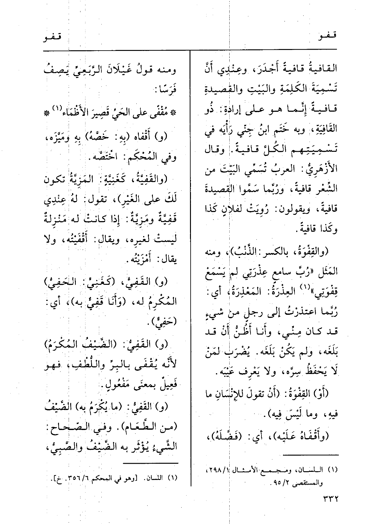 {القافِيَة} قافِيَة أَجْدَر؛ وَعِنْدِي أنَّ تَسْميةَ الكَلِمةِ والبَيْت والقَصِيدَةِ قافِيَةً إنَّما هُوَ على إرادَةِ ذُو القافِيَةِ، وَبِه خَتَمَ ابنُ جنِّي رأْيَهُ فِي تَسْمِيتِهم الكُلَّ قافِيَة.