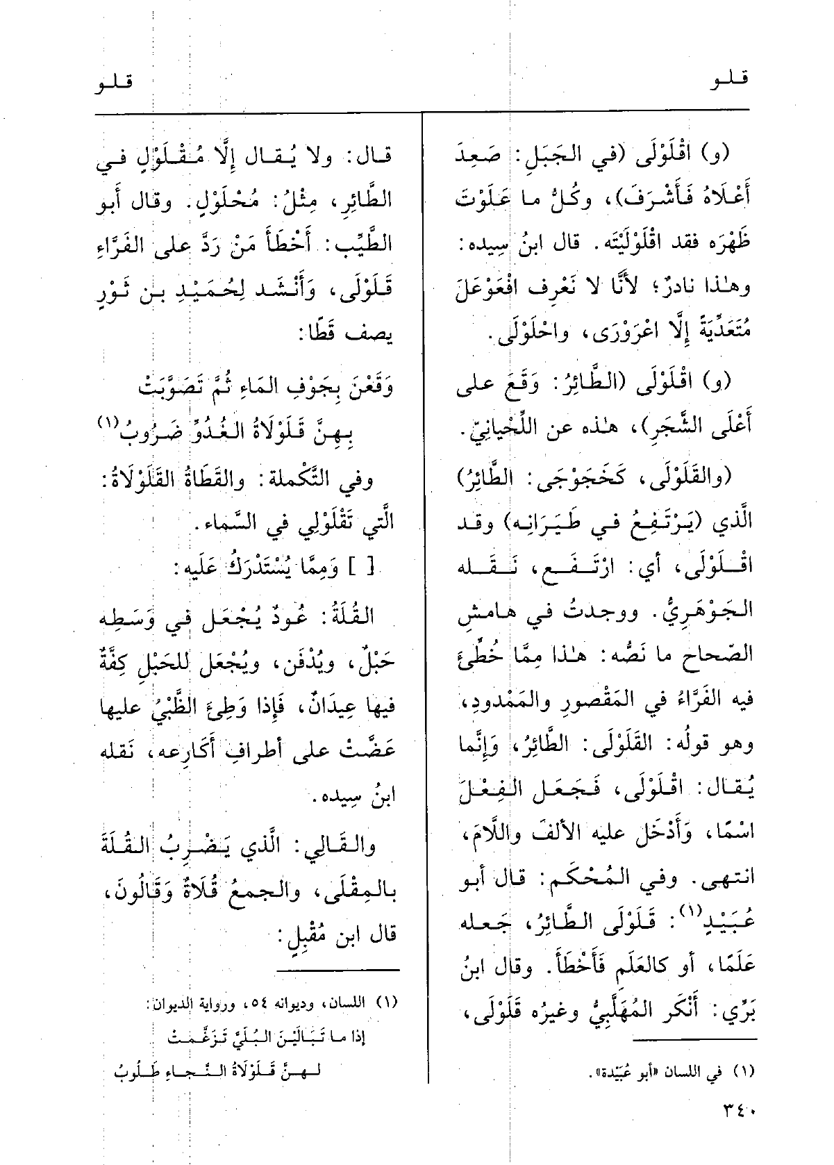 وقالَ أَبو الطَّيّب: أَخْطَأَ مَنْ رَدَّ عَلى الفرَّاء {قَلَوْلَى؛ وأَنْشَدَ لحميدِ بنِ ثَوْرٍ يصِفُ قَطاً: