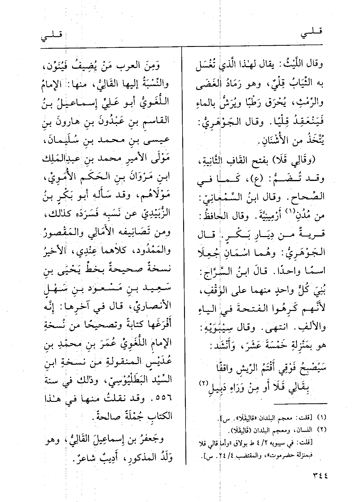 } بقالِي قَلاَ أَو من وَراء دَبيلِومِن العَرَبِ مَنْ يُضِيفُ فيُنوِّنُ؛ والنِّسْبَةُ إِلَيْهَا! القالِيُّ مِنْهَا: الإِمامُ اللُّغَويُّ أَبو عليَ إِسْماعيلُ بنُ القاسِمِ بنِ عَبْدونَ بنِ هَارونَ بنِ عيسَى بنِ محمدِ بنِ سُلَيْمان مَوْلَى الأمِير محمدِ بنِ عبدْ الملكِ بنِ مَرْوانَ بنِ الحَكَم الأُمَويّ مَوْلاهُم، وَقد سَأَلَه أَبو بكْرِ بنُ الزّبيدي عَن نَسَبِه فسَرَدَه كذلكَ، ومِن تَصانِيفِهِ الأمالي والمَقْصورُ والممدودُ، كِلاهُما عنْدِي الأخيرُ نسْخة صَحِيحةٌ بخطِّ يَحْيَى بنِ سَعِيدِ بنِ مَسْعودِ بنِ سَهْل الأنْصارِي قالَ فِي آخِرها: إنَّه أَفْرَغَهَا كِتابَةً وتَصْحيحاً مِن نَسْخَة الإمامِ اللّغَوي عُمَر بنِ محمدِ بنِ عديسِ المَنْقولَة من نَسْخَة ابنِ السيِّد البَطْليوسي وذلكَ فِي سَنَة 556، وَقد نَقَلْت مِنْهَا فِي هَذَا الكتابِ جملَة صَالِحَة. وجَعْفَرُ بنُ إسْماعيل القالِي، وَهُوَ وَلَدُ المَذْكُور، أَدِيبٌ شاعِرٌ.