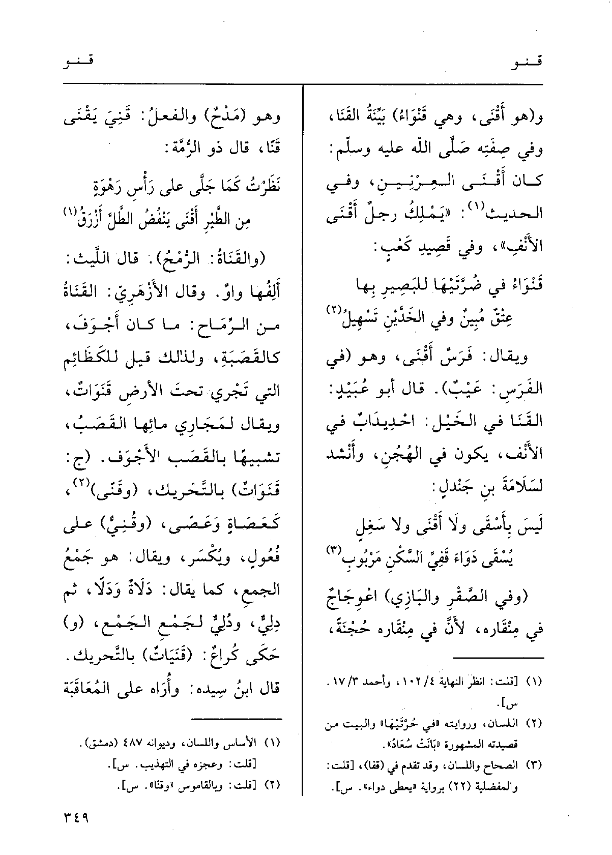 ليسَ بأَسْفَى وَلَا أَقْنَى وَلَا سَغِلٍ يُسْقَى دَواءَ قَفِيِّ السَّكْنِ مَرْبُوبِ (وَفِي الصَّقْرِ والبازِي) :) اعْوِجاجٌ فِي مِنْقارِهِ لأنَّ فِي مِنقارِهِ حُجْنة، وَهُوَ (مَدْحٌ) ، والفِعْلُ قَنِيَ يَقْنَى قَناً؛ قالَ ذُو الرُّمَّة: