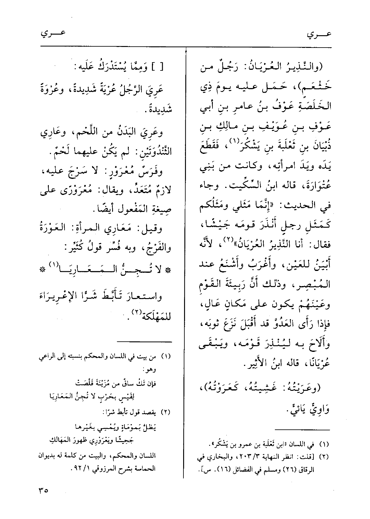 وجاءَ فِي الحديثِ: (إنَّما مَثَلي ومَثَلُكم كمَثَلِ رجُلٍ أَنْذَرَ قَوْمَه جَيْشاً فقالَ: أَنا النَّذِيرُ العُرْيان) ، لأنَّه أَبْيَنُ للعَيْن وأَغْرَب وأَشْنَع عنْدَ المُبْصِر، وذلكَ أنَّ رَبيئَةَ القوْمِ وعَيْنَهم يكونُ على مكانٍ عالٍ، فَإِذا رأَى العَدُوَّ قد أَقْبَل نَزَع ثَوْبَه وأَلاحَ بِهِ ليُنْذِرَ قَوْمَه ويَبْقى عُرْياناً؛ قالَهُ ابنُ الْأَثِير.