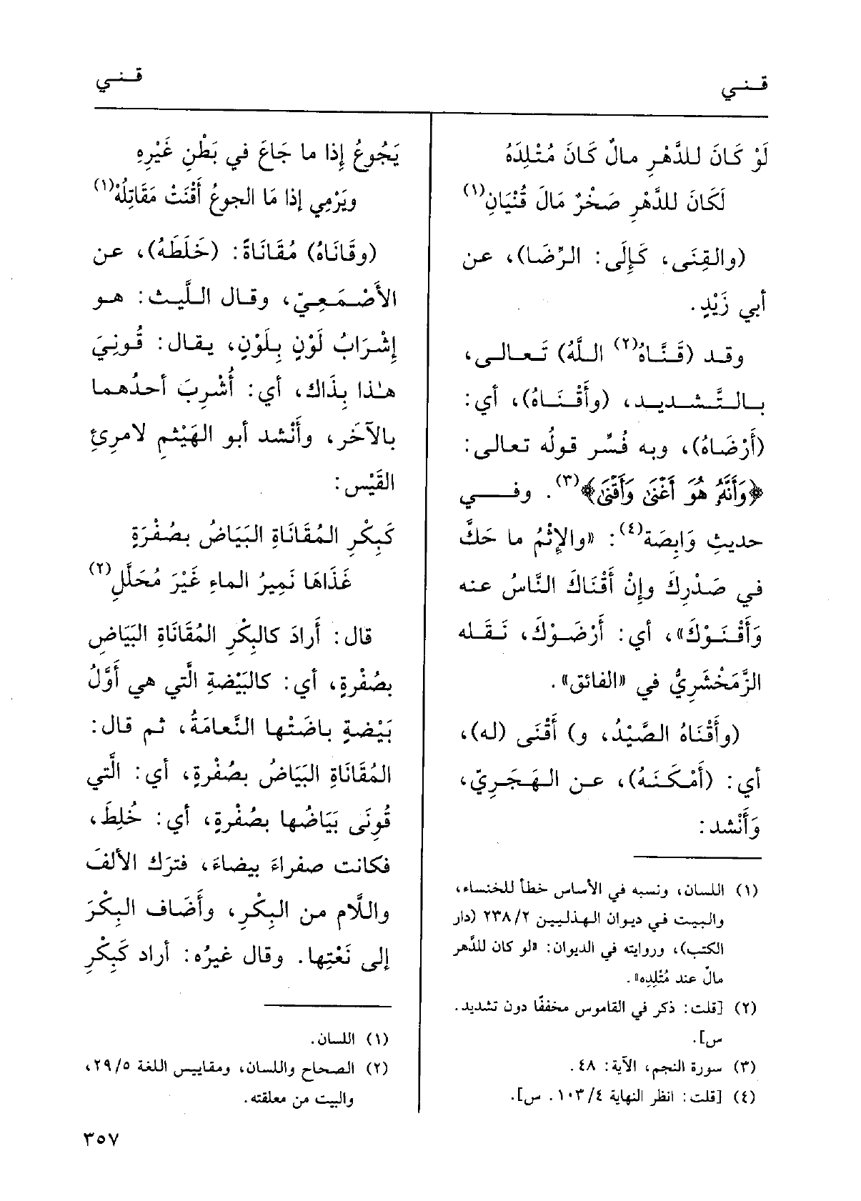 لَو كانَ للدَّهْرِ مالُ كانَ مُتْلِدَه لَكَانَ للدَّهرِ صَخْرٌ مالَ {قُنْيانِ (} والقِنَى: كإِلَى: الرِّضا) ؛) عَن أبي زيْدٍ.