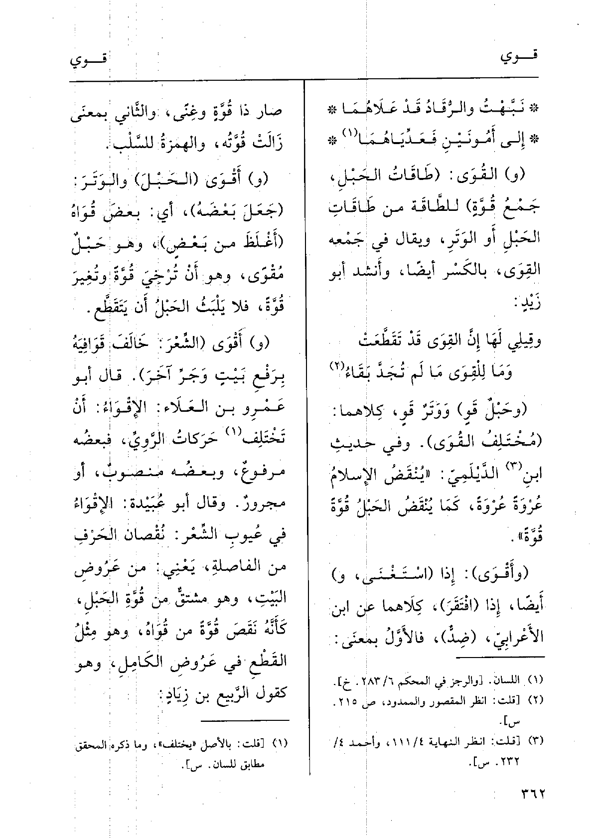 نَبَّهْتُ والرُّقادُ قد عَلاهُما إِلَى أَمُونَيْنِ فَعَدَّياهُما (و) {القُوَى: (طاقاتُ الحَبْلِ، جَمْعُ} قُوَّة) للطَّاقَةِ من طَاقاتِ الحَبْلِ أَو الوَتَرِ، ويقالُ فِي جَمْعِه {القِوَى، بالكسْرِ أيْضاً؛ وأَنْشَدَ أَبُو زَيدٍ: