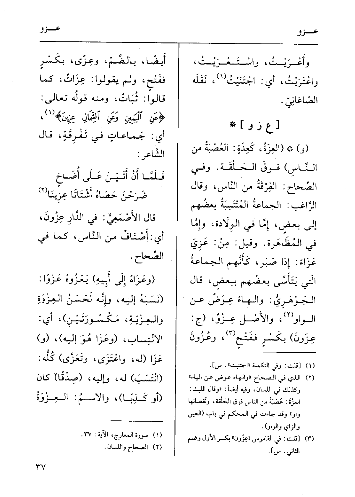 وقالَ الراغبُ: الجماعَةُ المُنْتَسبَةُ بعضُهم إِلَى بعضٍ إمَّا فِي الوِلادَةِ، وإمَّا فِي المظاهَرَةِ. وقيلَ: من {عَزِيَ} عَزَاءً إِذا صَبَرَ، كأنَّهم الجماعَةُ الَّتِي يتَأَسَّى بعضُهم ببعضٍ، قَالَ الْجَوْهَرِي: والهاءُ عِوَضٌ عَن الواوِ، والأصْلُ {عِزْوٌ، (ج} عِزَوْنَ) بكسْرٍ فَفتح، {وعُزُونَ أَيْضاً بالضمِّ،} وعِزًى بكسْرٍ ففتحٍ، وَلم يقولُوا {عِزَات كَمَا قَالُوا ثُبات؛ وَمِنْه قولُه تَعَالَى: {عَن اليَمِين وَعَن الشِّمالِ} عِزِينَ} ، أَي جَمَاعَات فِي تَفْرقة؛ قالَ الشاعِرُ: