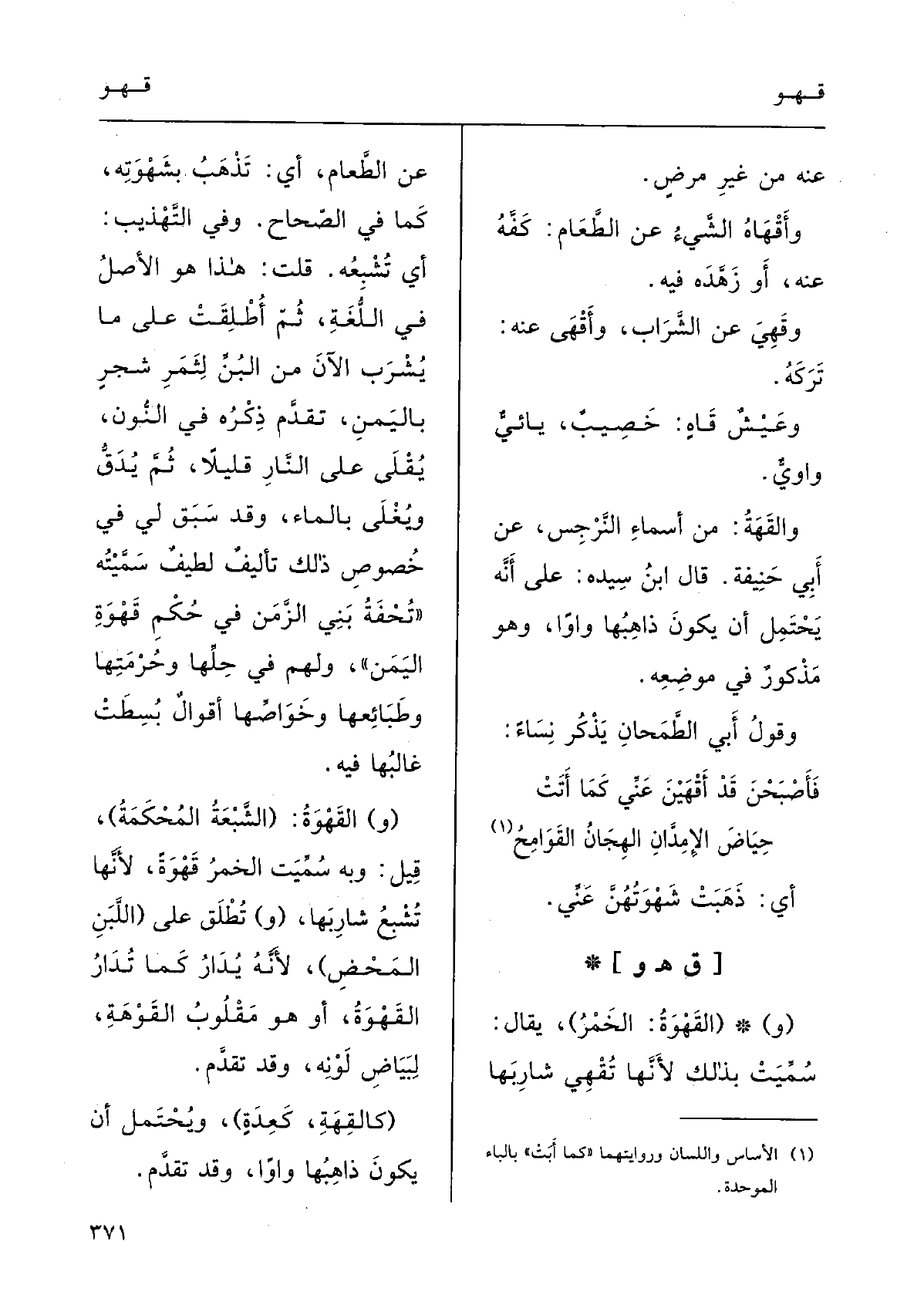 قُلْت: هَذَا هُوَ الأصْلُ فِي اللُّغَةِ ثمَّ أُطْلِقَت على مَا يُشْرَبُ الآنَ مِن البُنِّ لثمَرِ شَجَرٍ باليَمَنِ، تقدَّمَ ذِكْرُه فِي النونِ يُقْلَى على النارِ قَلِيلاً ثمَّ يدُقُّ، ويُغْلَى بالماءِ وَقَد سَبَقَ لي فِي خُصُوصِ ذلكَ تَأْلِيفٌ لَطِيفٌ سَمَّيْته تُحْفَة بَني الزَّمن فِي حُكْم {قَهْوَةِ اليَمَنِ، وَلَهُم فِي حلِّها وحرمَتِها وطَبائِعِهَا وَخَواصِّها أَقْوالٌ بسَّطت غالِبَها فِيهِ.
