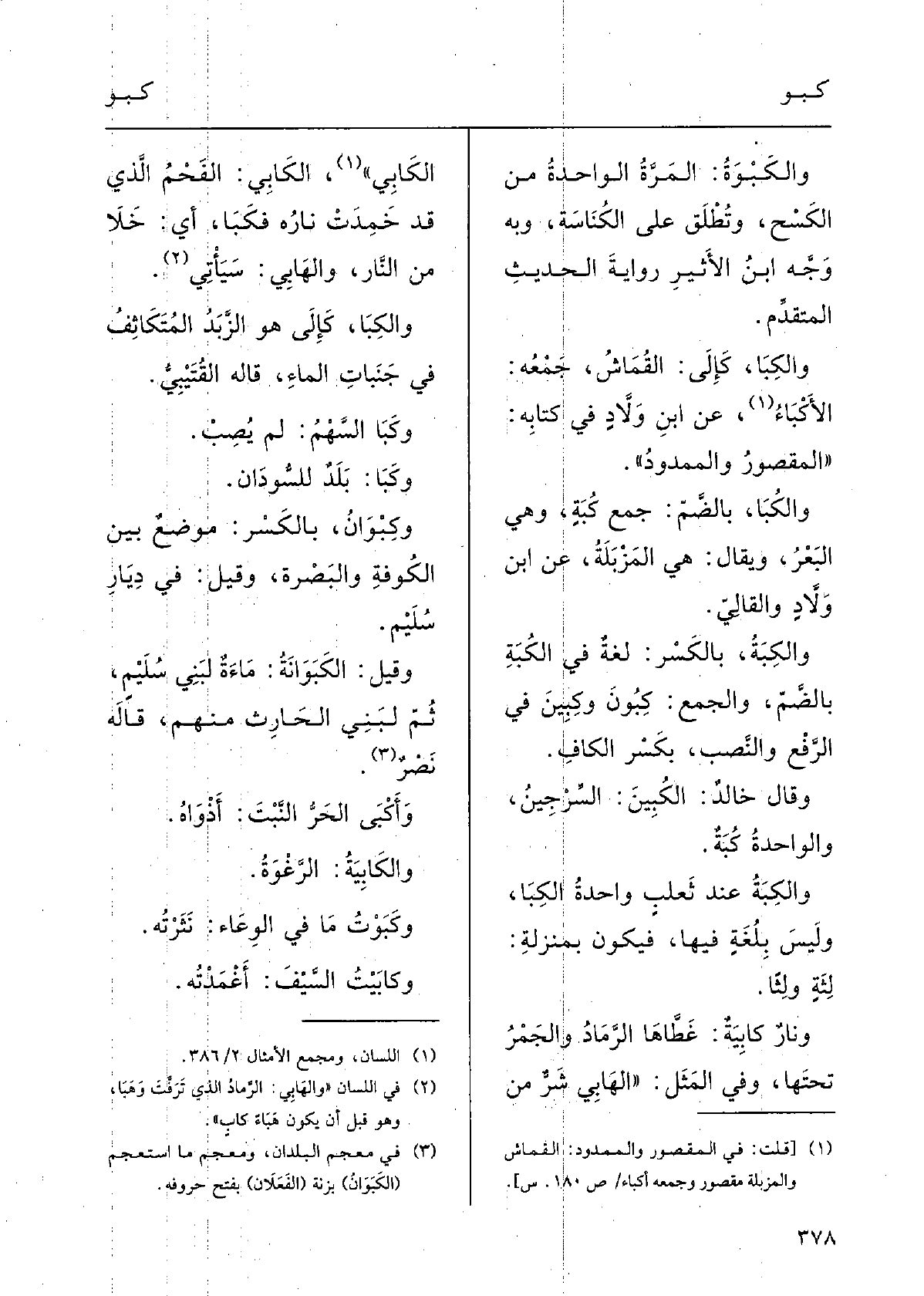 } والكُبا، بالضمِّ: جَمْعُ {كُبةٍ، وَهِي البَعَرُ، ويقالُ هِيَ المَزْبَلَةُ؛ عَن ابنِ ولاَّد والقالِي.